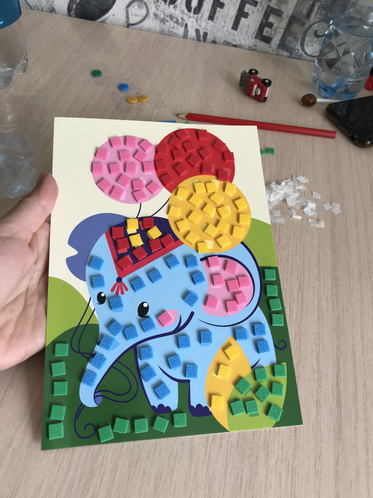 Аппликация хорошая. Квадратики совсем малюсенькие и порой тяжеловато отрываются друг от друга. Ребенку 2.8 зашло на отлично, но пришлось помогать отклеивать эти квадратики, отрывать их друг от друга