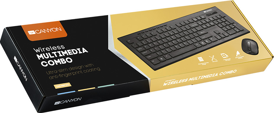 Canyon Клавиатура и мышь Сanyon CNS-HSETW4-RUВ данный момент этот товар отсутствует в продаже. Возможно, у нас найдется аналогичный или похожий товар здесь. Этот беспроводной набор состоит из ультратонкой беспроводной клавиатуры и компактной мыши. Благодаря текстуре поверхности, мышь и клавиатура защищены от пятен и отпечатков пальцев. Клавиши прочные и приятные на ощупь, практически не слышны при наборе текста. Над стандартным набором клавиш клавиатуры размещены мультимедийные кнопки, позволяющие быстро управлять браузером, медиаплеером, звуком и калькулятором. Свойства мыши позволяют переключать значение DPI между 800, 1200, 1600, что дает максимальную точность курсора при работе на разных экранах. |