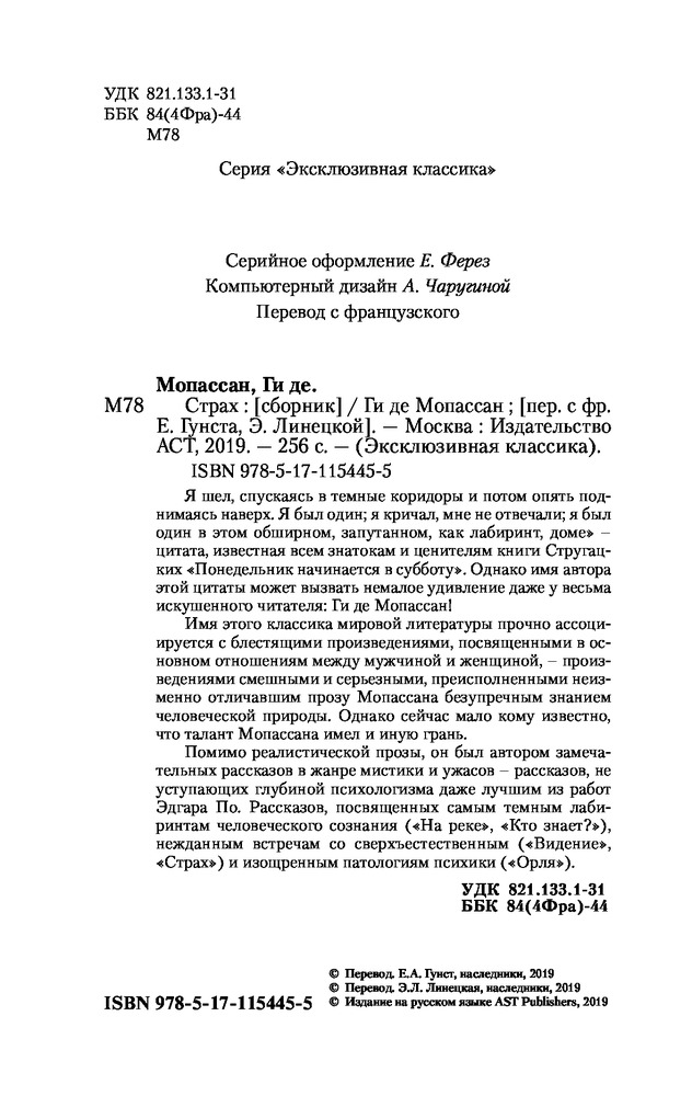 💳 Оплатить за товар можно при получении 🇰🇿 Есть бесплатная доставка по Казахстану от 1 дня 🎁 Копите бонусы с каждой покупки Серия: Эксклюзивная классика «Я шел, спускаясь в темные коридоры и потом опять поднимаясь наверх. Я был один; я кричал, мне не отвечали; я был один в этом обширном, в запутанном, как лабиринт, доме» — цитата, известная всем знатокам и ценителям книги Стругацких «Понедельник начинается в субботу». Однако имя автора этой цитаты может вызвать немалое удивление даже у весьма искушенного читателя: Ги де Мопассан! |