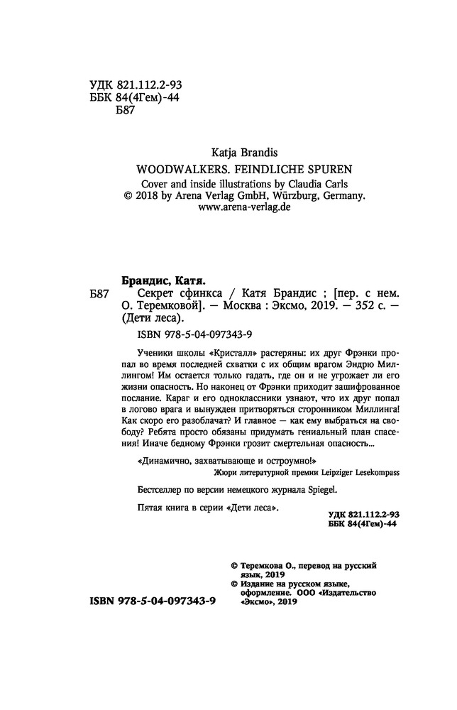 Секрет сфинксаВ данный момент этот товар отсутствует в продаже. Возможно, у нас найдется аналогичный или похожий товар здесь. Серия: Детская. Дети леса Ученики школы «Кристалл» растеряны: их друг Фрэнки пропал во время последней схватки с их общим врагом Эндрю Миллингом! Им остаётся только гадать, где он и не угрожает ли его жизни опасность. Но наконец от Фрэнки приходит зашифрованное послание. Караг и его одноклассники узнают, что их друг попал в логово врага и вынужден притворяться сторонником Миллинга! Как скоро его разоблачат? И главное — как ему выбраться на свободу? Ребята просто обязаны придумать гениальный план спасения! Иначе бедному Фрэнки грозит смертельная опасность... «Динамично, захватывающе и остроумно!», жюри литературной премии Leipziger Lesekompass Бестселлер по версии немецкого журнала Spiegel Пятая книга в серии «Дети леса». |
