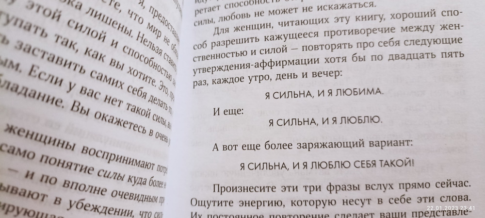 Ну что сказать... Написано явно для женщин, причем, кто ни разу не открывал других книг по психологии. Банальные фразы : Я любима, я все могу... И так всю книгу. На фото один из примеров про что книга. И так вся книга в этом духе. Не понимаю, почему такая чушь популярна. Книгу просто выкинул.