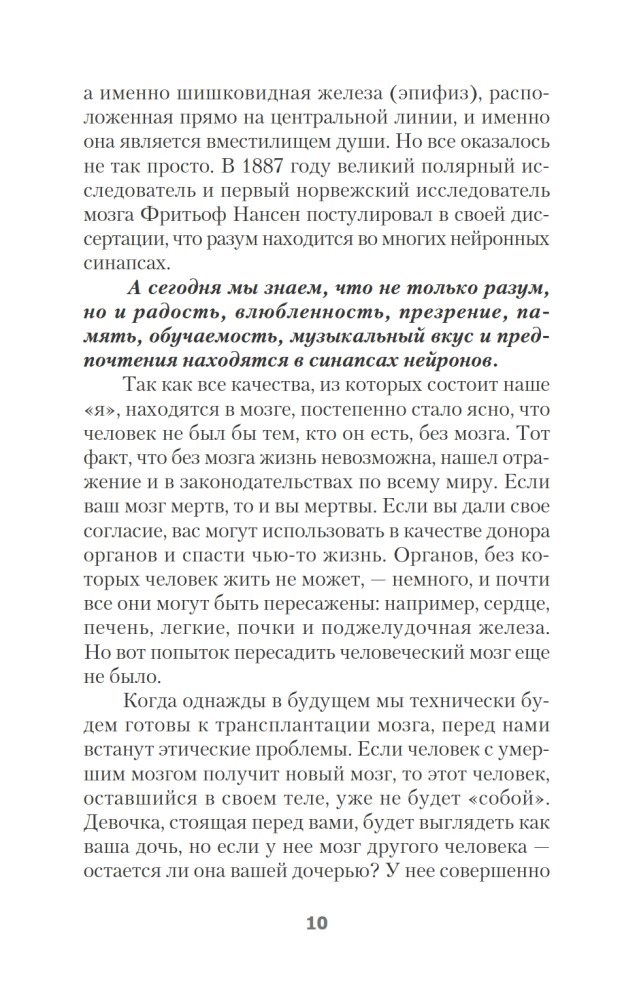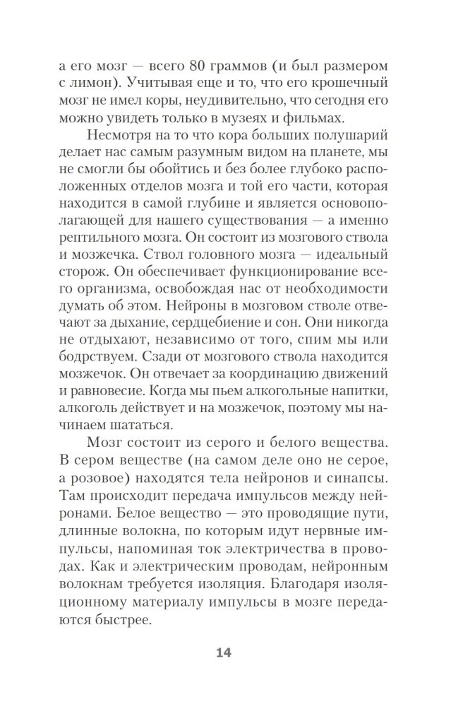 💳 Оплатить за товар можно при получении 🇰🇿 Есть бесплатная доставка по Казахстану от 1 дня 🎁 Копите бонусы с каждой покупки Серия: #экопокет Что делает нас нами? Где начинается мысль? Разум и память, влюбленность и ненависть, логика и обучаемость, — элементы, из которых состоит наше «я», находятся в самом незаменимом органе нашего тела — мозге. Приготовьтесь отправиться в увлекательнейшее путешествие по мозгу и узнать, где находится личность, почему важно уметь забывать, в каком отделе мозга спрятан компас, откуда берутся ложные воспоминания, где хранятся эмоции и можно ли повлиять на свое настроение, и даже о том, почему мы едим мозгом. «Эта книга написана так, словно я беседую о мозге со своими близкими друзьями, и очень надеюсь, что вы, как и я, будете очарованы его многочисленными тайнами. Вы удивитесь тому, как много делает эта масса розоватого цвета, расположенная между ушами.» Кайя Норденген «Прочитайте эту книгу! На нее стоит потратить время.» Мэй-Бритт Мозер, профессор, психолог, нейрофизиолог, нобелевский лауреат. |