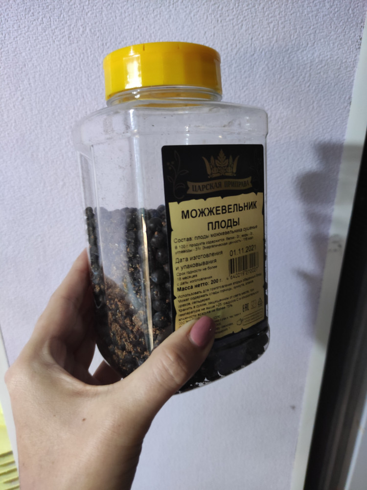 Ранее при упоминании в рецептах ягод можжевельника пропускал эту часть, либо вообще переходила к следующему блюду. В виду того, что в магазинах такой приправы попросту не видела вообще никогда нигде. Увидев на сайте, сразу приобрела. В банке значительно меньше ягод по объёму , чем на фото, но по весу все совпадает. В принципе, учитывая, что среднестатистическая хозяйка о можжевельнике даже не слышала, добавлять в блюда вы будете его не часто. А посему такого количества хватит надолго. К примеру на приготовление тушеной рыбы в количестве 2 кг с морковью и помидорами уходит примерно 1 ст. л ягод. Это не так много. Не скажу, что вкус блюд кардинально меняет, но свою изюминку придаёт. Стоит попробовать. Использую в основном в рыбных блюдах.