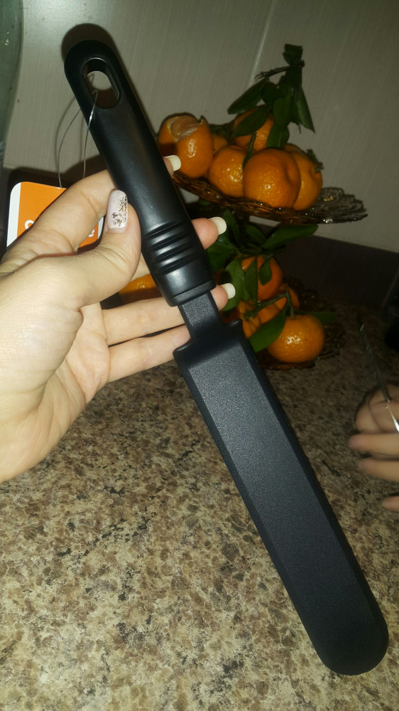 Лопатка пришла совсем другая-абсолютная ровная, без изгиба. Даже не представляю, куда ее можно применить. Блины точно переворачивать не буду. Разве что, крем на тортах разравнивать попробую. Возвращать не стала - сразу не заметила, не думала, что такое может быть.