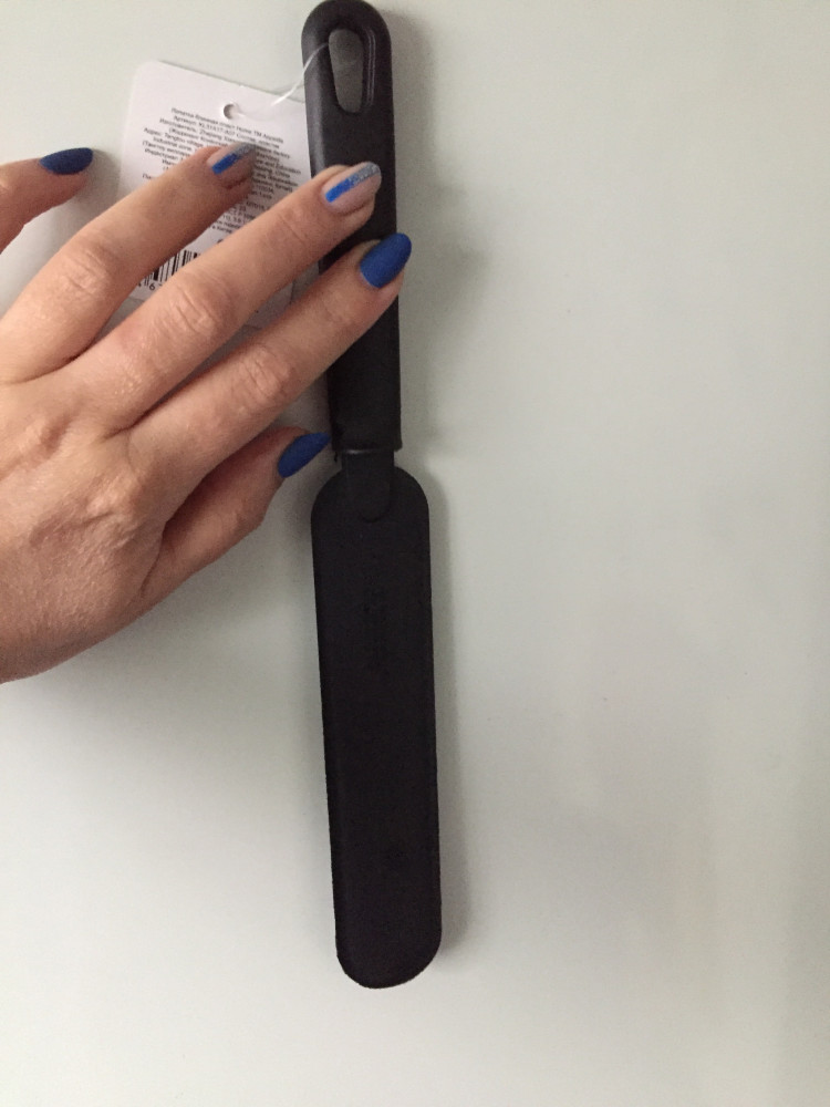Удивлена, что такая удобная лопаточка и так недорого стоит. Она из плотного пластика, не гибкая. Достаточно длинненькая, удобная, тонкая.
