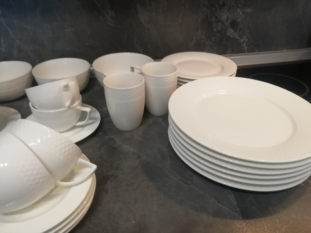 Купила весь сервиз 6 таких тарелок, 6 суповых, 6 десертных, чайный сервиз 6 пар, 2 салатника 14 см, 1 салатник 16 см, 2 кружки 350 мл, чайник, сахарница, молочник. Всё это серии Юлия Высоцкой. Ещё добавила серию fine 4 кружки 460 мл, 4 пирожковых тарелки 15 см, 3 чашки для мюсли и масленку. Получилось очень красиво.