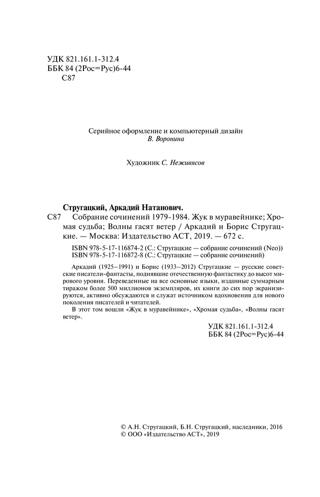 Собрание сочинений 1979-1984Аркадий Натанович Стругацкий, Борис Натанович Стругацкий В данный момент этот товар отсутствует в продаже. Возможно, у нас найдется аналогичный или похожий товар здесь. Серия: Стругацкие - собрание сочинений (Neo) Аркадий (1925–1991) и Борис (1933–2012) Стругацкие — русские советские писатели-фантасты, поднявшие отечественную фантастику до высот мирового уровня. Переведенные на все основные языки, изданные суммарным тиражом более 500 миллионов экземпляров, их книги до сих пор экранизируются, активно обсуждаются и служат источником вдохновения для нового поколения писателей и читателей. В этот том вошли «Жук в муравейнике», «Хромая судьба», «Волны гасят ветер». |