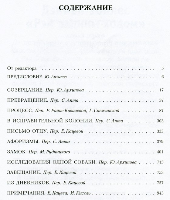 Хорошее качество и оформление книги, отличная подборка произведений. Единственный минус со стороны сайта - это то , что в описании подобных собраний сочинений не пишут список произведений, содержащихся в книге. Хотелось бы точно знать, что именно покупаешь. Поэтому вот список , может кому пригодится - "Созерцание", "Превращение", "Процесс", "В исправительной колонии", "Письмо отцу", "Афоризмы", "Замок", "Исследование одной собаки", "Завещание", "Из дневников".
