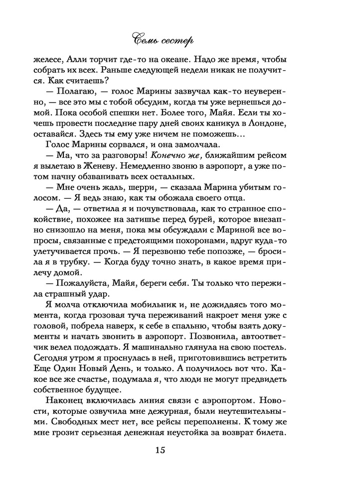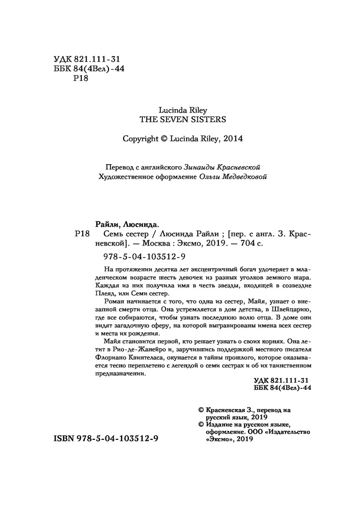 Семь сестерВ данный момент этот товар отсутствует в продаже. Возможно, у нас найдется аналогичный или похожий товар здесь. Серия: Семь сестер. Мировые хиты Люсинды Райли На протяжении десятка лет эксцентричный богач удочеряет в младенческом возрасте шесть девочек из разных уголков земного шара. Каждая из них получила имя в честь звезды, входящей в созвездие Плеяд, или Семи сестер. Роман начинается с того, что одна из сестер, Майя, узнает о внезапной смерти отца. Она устремляется в дом детства, в Швейцарию, где все собираются, чтобы узнать последнюю волю отца. В доме они видят загадочную сферу, на которой выгравированы имена всех сестер и места их рождения. Майя становится первой, кто решает узнать о своих корнях. Она летит в Рио-да-Жанейро и, заручившись поддержкой местного писателя Флориано Квинтеласа, окунается в тайны прошлого, которое оказывается тесно переплетено с легендой о семи сестрах и об их таинственном предназначении. |