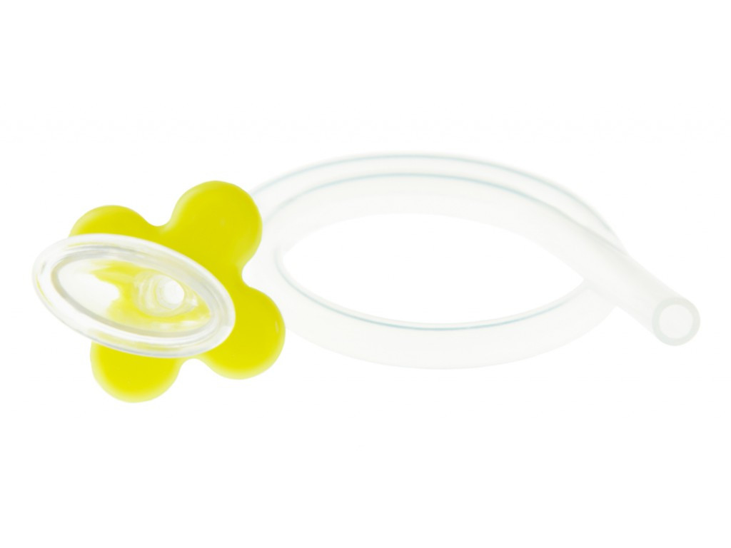 • яркий ограничитель в виде цветочка привлекает внимание ребенка и позволяет маме удобно держать мундштук во рту;