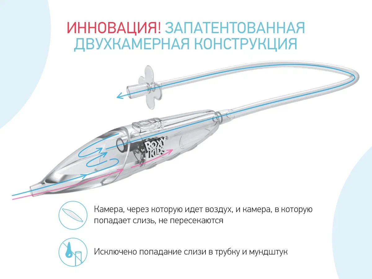 • запатентованная двухкамерная конструкция: камера, через которую идет воздушный поток, и камера, в которую попадает слизь, не пересекаются, это полностью исключает попадание выделений в трубку, поэтому не нужны никакие фильтры;