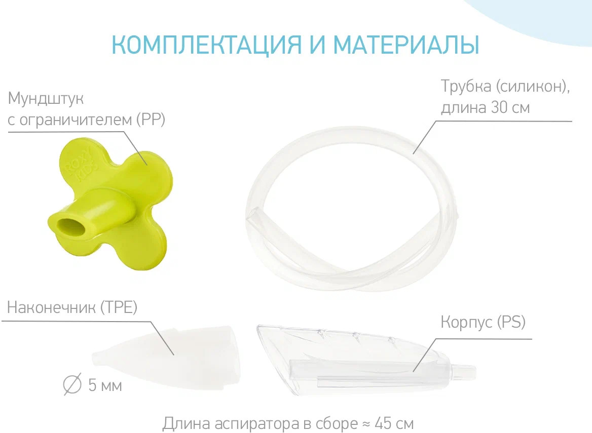 • все материалы абсолютно безопасны и гипоаллергенны: полистирол (корпус и мундштук), термоэластопласт (наконечник), полипропилен (ограничитель), медицинский силикон (трубка);