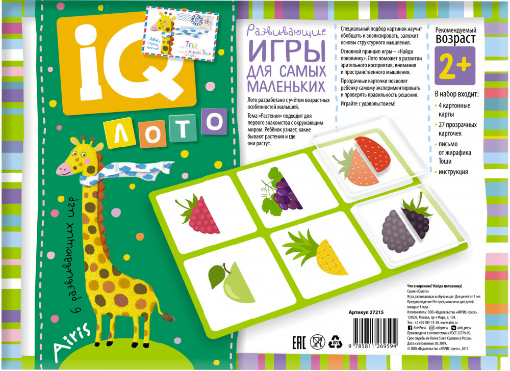 Основной принцип игры — «Подбери силуэт». Лото поможет в развитии зрительного восприятия, внимания и пространственного мышления. Прозрачные карточки позволят ребёнку самому экспериментировать и проверять правильность решения.