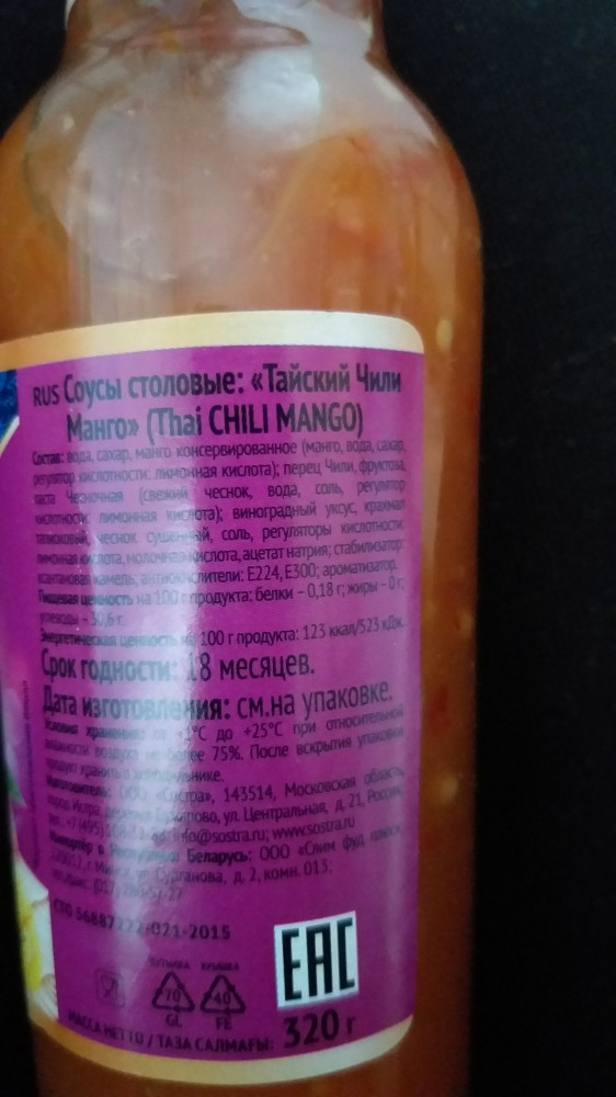 Очень понравился соус. Думала будет очень сладким, но нормально. Брала как-то соус Чили сладкий для курицы от арой, вот там супер сладкий и много не съешь. Привкус манго интересный. Едим обычно с курицей. Бутылек удобный, хранится долго. Спасибо!