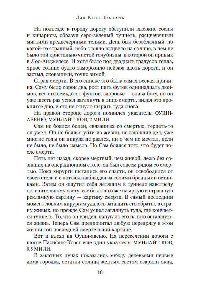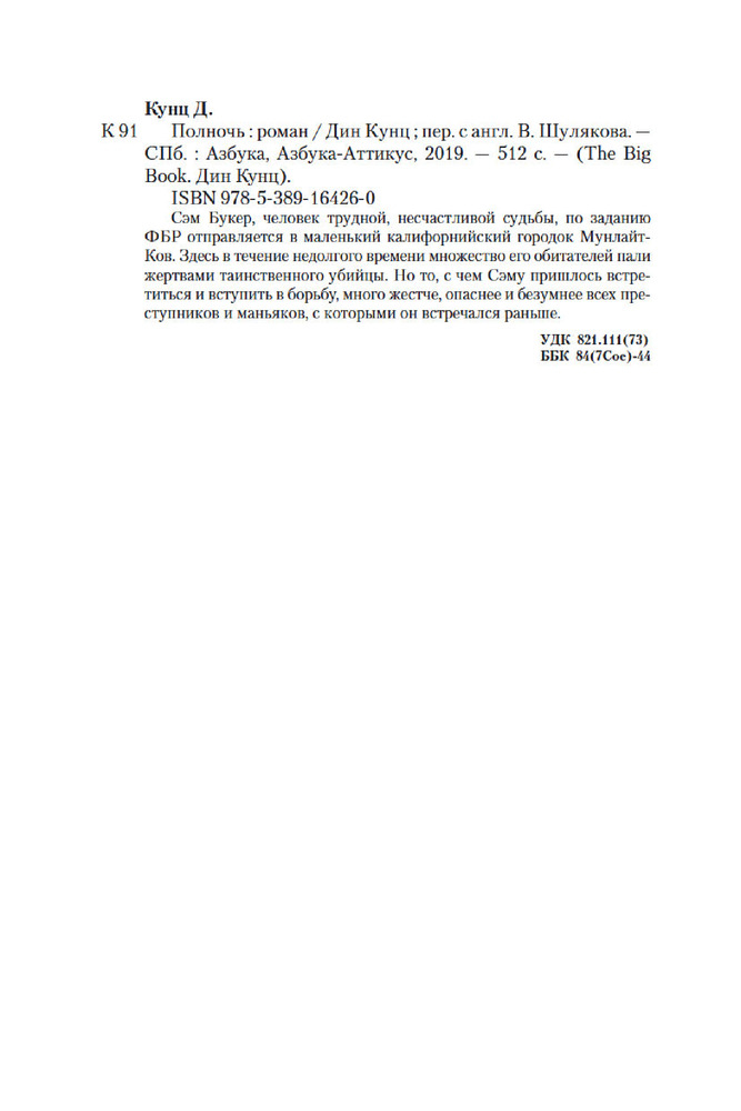 В данный момент этот товар отсутствует в продаже. Возможно, у нас найдется аналогичный или похожий товар здесь. Серия: The Big Book Сэм Букер, человек трудной, несчастливой судьбы, по заданию ФБР отправляется в маленький калифорнийский городок Мунлайт-Ков. Здесь в течение недолгого промежутка времени множество его обитателей пали жертвами таинственного убийцы. Но то, с чем ему пришлось встретиться и вступить в борьбу, много жестче, опаснее и безумнее всех преступников и маньяков, с которыми он встречался раньше. |
