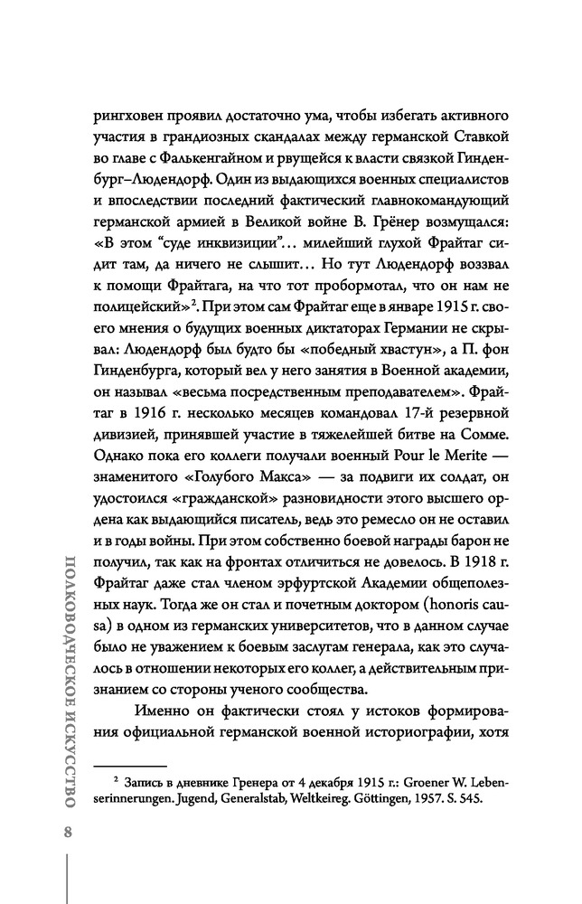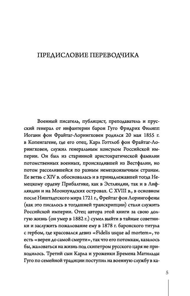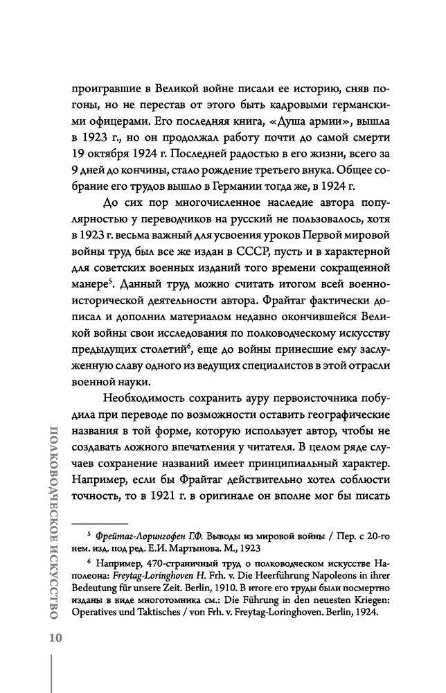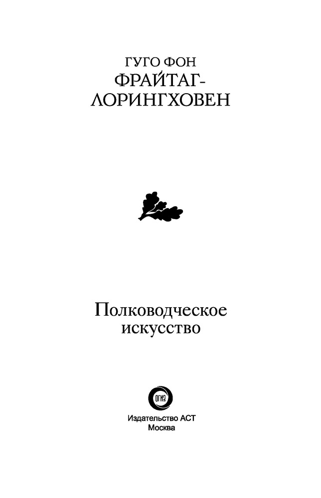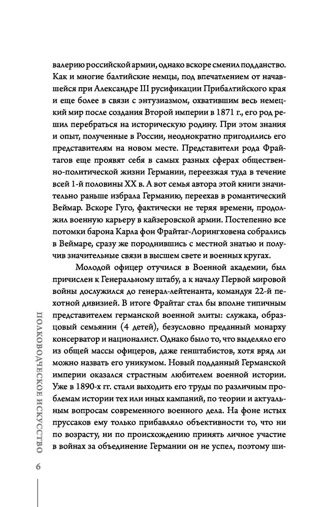 Военный писатель, публицист, преподаватель и прусский генерал от инфантерии барон Гуго Фридрих Филипп Иоганн фон Фрайтаг-Лорингховен (1855-1924) в начале ХХ в. считался одним из ведущих германских военных мыслителей, причем не только по историческим проблемам, но и по актуальным вопросам военного строительства. Его труд «Полководческое искусство» стал итогом всей военно-исторической деятельности автора и своего рода энциклопедией военного дела XVIII — начала XX в.