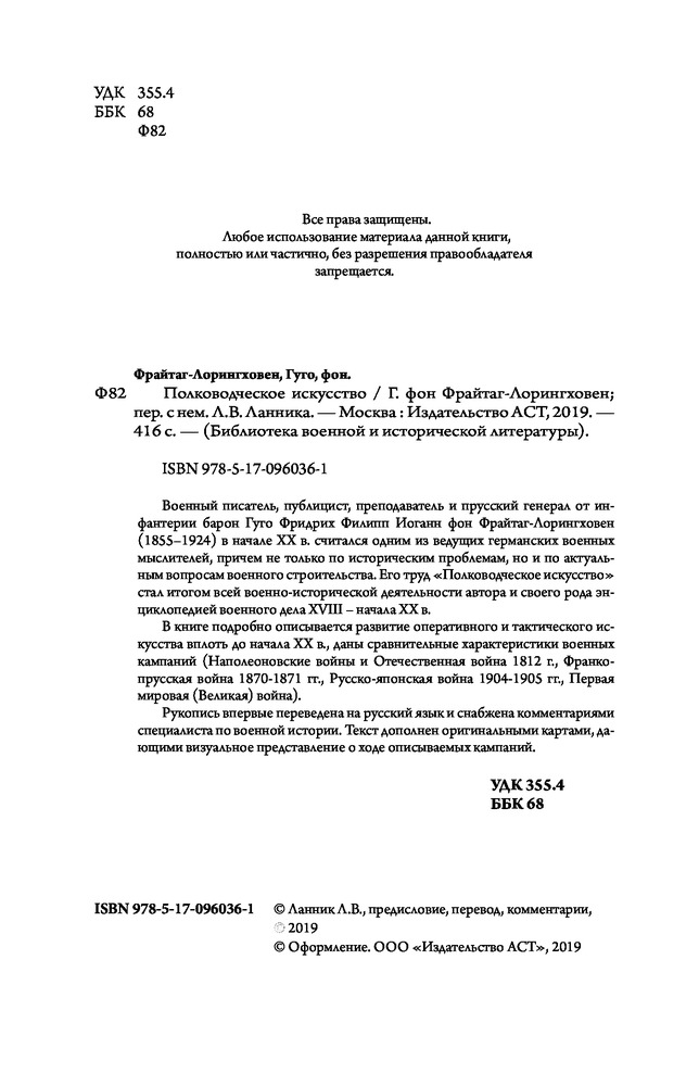 Серия: Библиотека военной и исторической литературы Военный писатель, публицист, преподаватель и прусский генерал от инфантерии барон Гуго Фридрих Филипп Иоганн фон Фрайтаг-Лорингховен (1855-1924) в начале ХХ в. считался одним из ведущих германских военных мыслителей, причем не только по историческим проблемам, но и по актуальным вопросам военного строительства. Его труд «Полководческое искусство» стал итогом всей военно-исторической деятельности автора и своего рода энциклопедией военного дела XVIII — начала XX в.