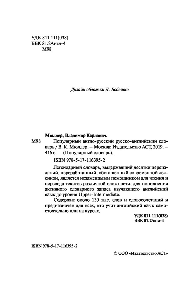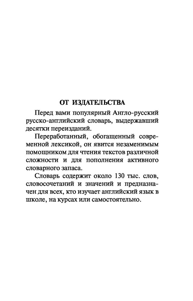 Популярный англо-русский русско-английский словарьВ данный момент этот товар отсутствует в продаже. Возможно, у нас найдется аналогичный или похожий товар здесь. Серия: Популярный словарь Легендарный словарь, выдержавший десятки переизданий, переработанный, обогащенный современной лексикой, является незаменимым помощником для чтения и перевода текстов различной сложности, для пополнения активного словарного запаса изучающего английский язык до уровня Upper-Intermediate. Содержит около 130 тыс. слов и словосочетаний и предназначен для всех, кто учит английский язык самостоятельно или на курсах. |