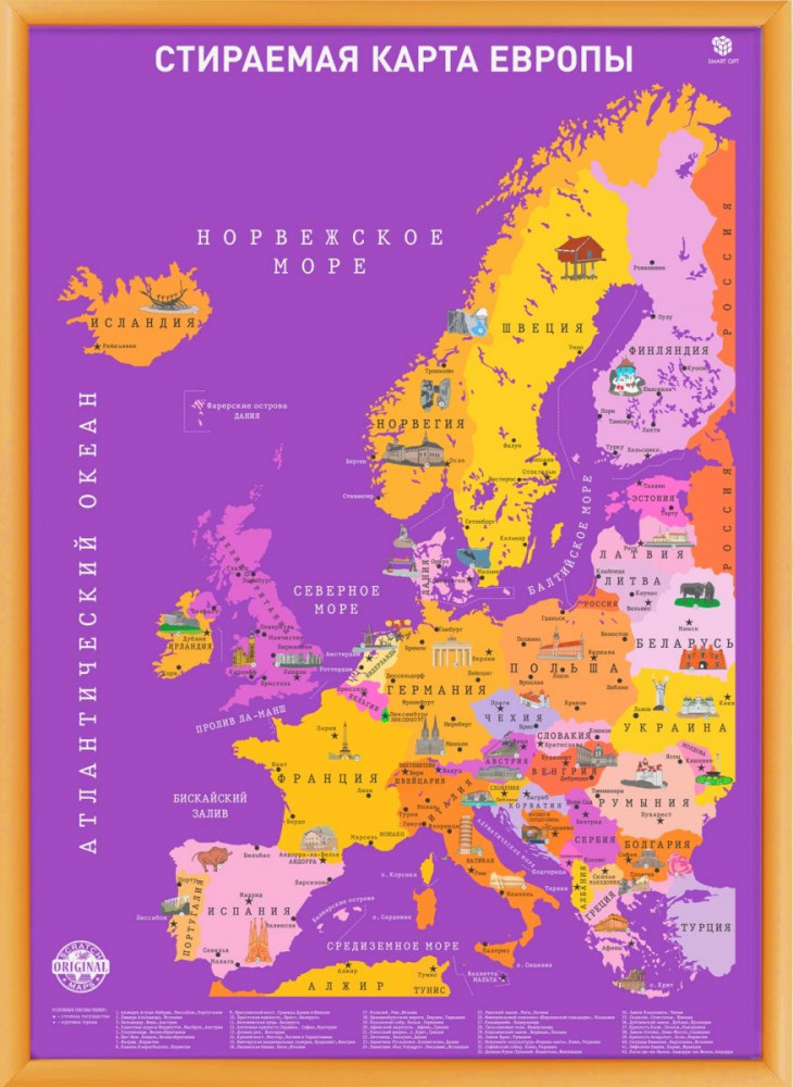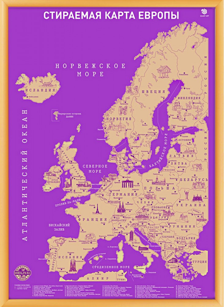 💳 Оплатить за товар можно при получении 🇰🇿 Есть бесплатная доставка по Казахстану от 1 дня 🎁 Копите бонусы с каждой покупки Часто ездите по Европе или планируете начать? Тогда эта карта — как раз для вас! Стильная фиолетово-золотая карта формата А2 украсит любой интерьер — и второй такой ни у кого не будет, ведь на ней отмечены только ваши поездки. Мягкий скретч-слой легко снимается и монеткой, и кредиткой, и даже просто ногтем, а под ним, помимо названия страны, нарисованы самые популярные её достопримечательности и традиционные напитки. Кстати, полезные факты о разных странах можно найти и в нижней части карты. |