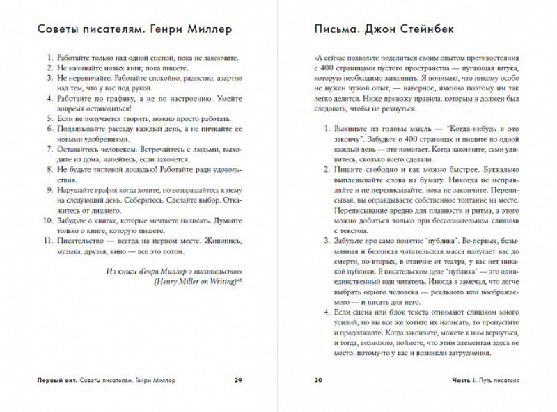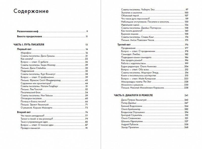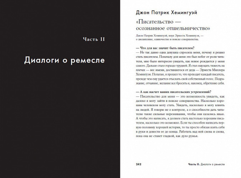 • в книге множество советов и цитат из интервью, книг, писем классиков и выдающихся писателей современности. Диалоги с российскими и зарубежными авторами во второй части книги — это возможность узнать о непростой работе писателя из первых рук, понять, как найти свой писательский голос и какие подводные камни встречаются на пути к изданию книги.
