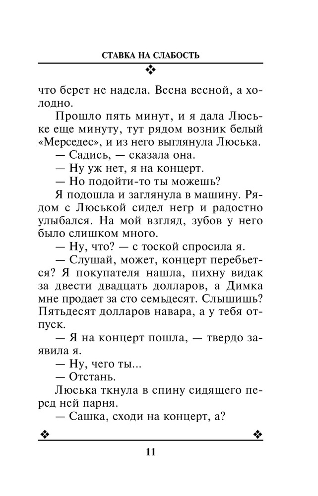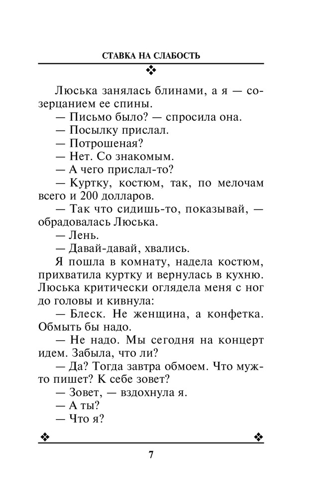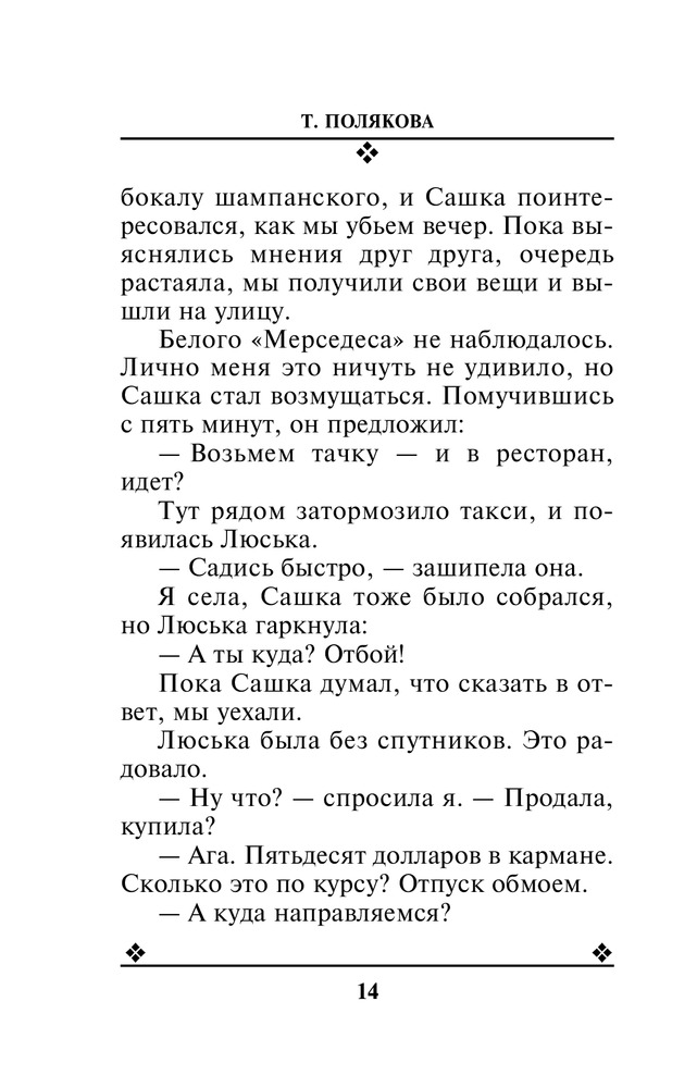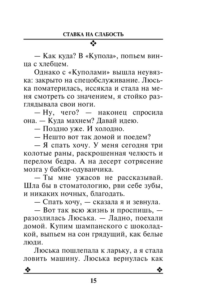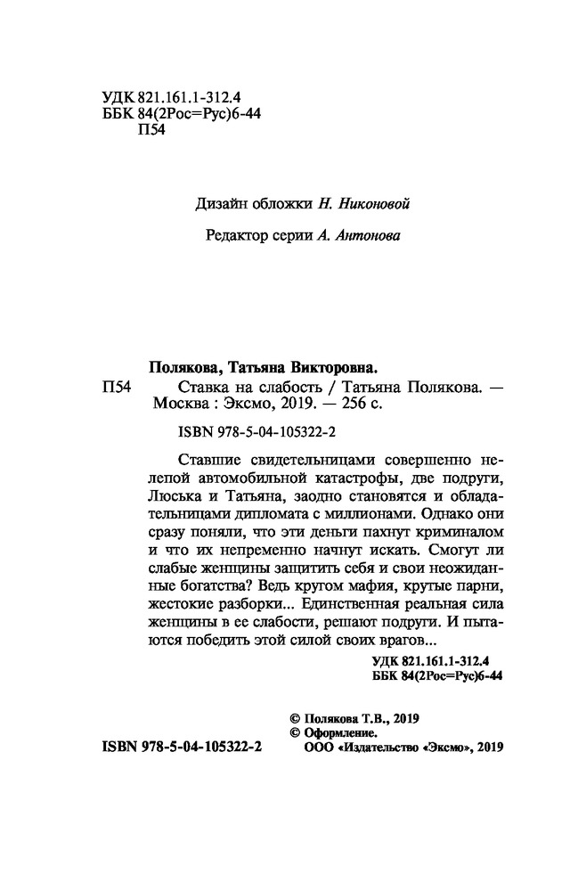 Ставка на слабостьВ данный момент этот товар отсутствует в продаже. Возможно, у нас найдется аналогичный или похожий товар здесь. Серия: Авантюрный детектив. Романы Т. Поляковой (обложка) Ставшие свидетельницами совершенно нелепой автомобильной катастрофы, две подруги Люська и Татьяна заодно становятся и обладательницами дипломата с миллионами. Однако они сразу поняли, что эти деньги пахнут криминалом, и что их непременно начнут искать. Смогут ли слабые женщины защитить себя и свои неожиданные богатства? Ведь кругом мафия, крутые парни, жестокие разборки... Единственная реальная сила женщины в ее слабости, решают подруги. И пытаются победить этой силой своих врагов... |