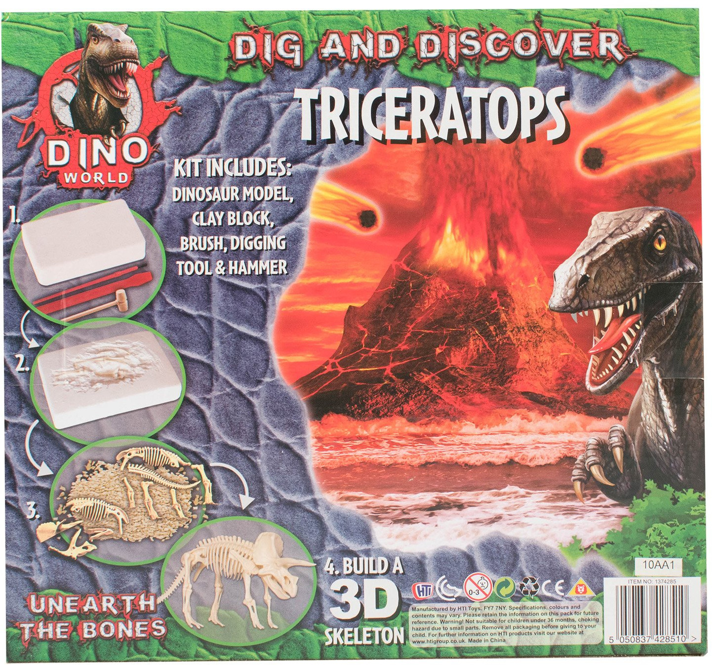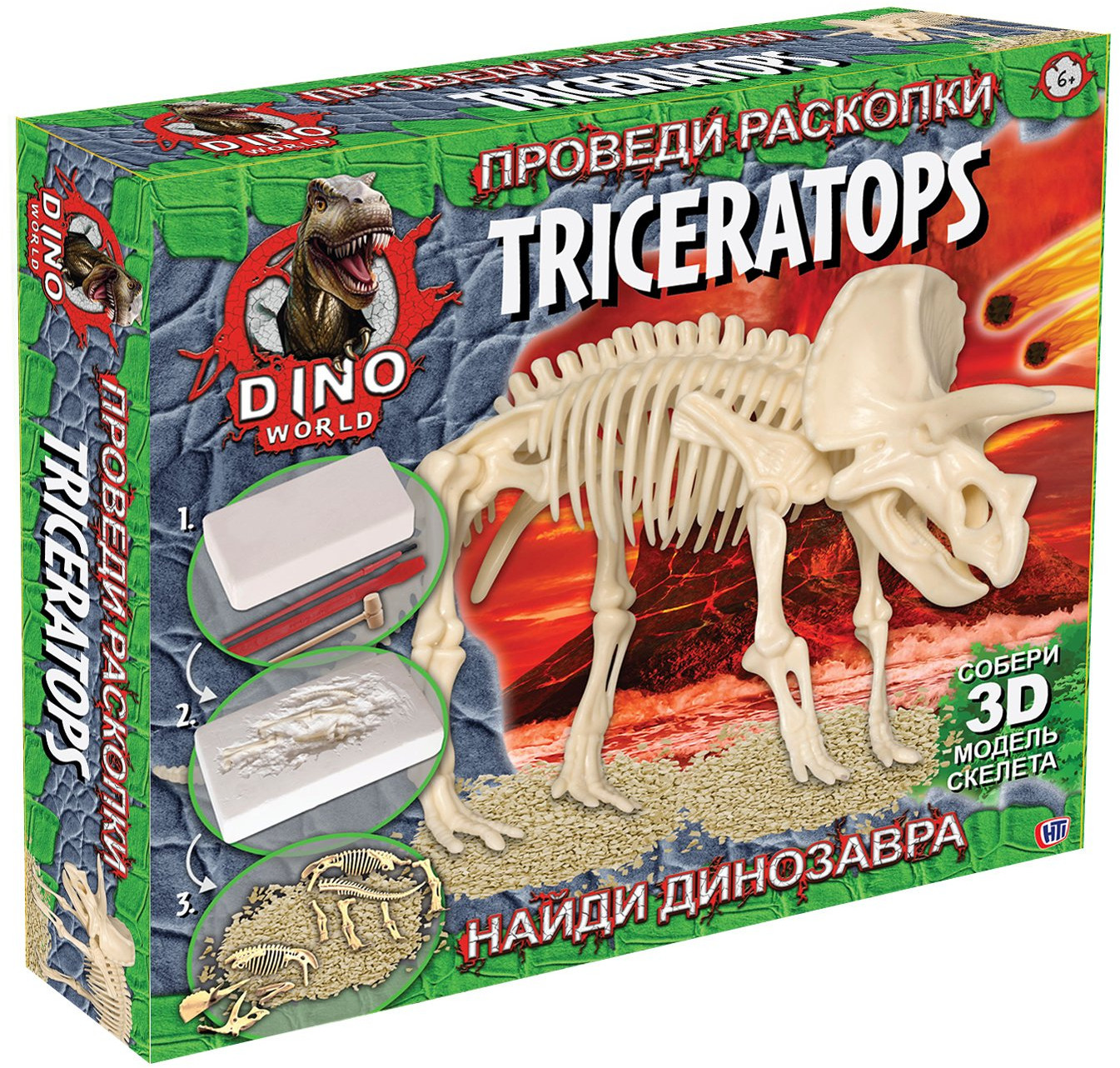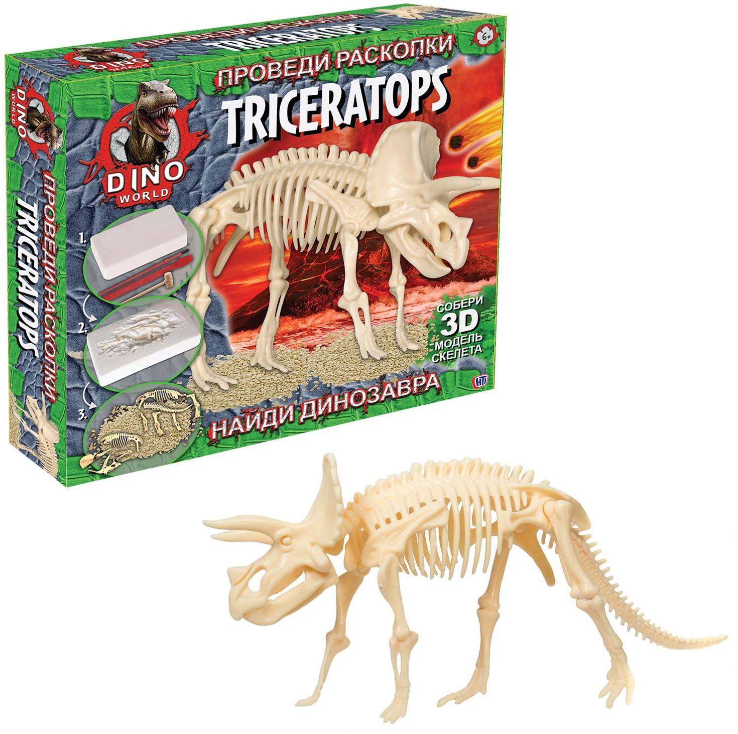 С данным набором ваш ребенок почувствует себя настоящим палеонтологом и познакомится с одним из обитателей мелового периода нашей планеты — трицератопсом. Ребенку предстоит произвести раскопки при помощи специальных инструментов, которые входят в набор.