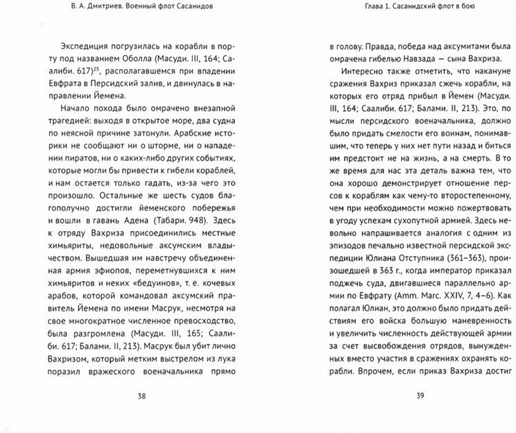 "Военный флот Сасанидов" - небольшая, но интересная книга кандидата исторических наук, доцента кафедры всеобщей истории Псковского государственного университета, специалиста по истории Ирана эпохи Сасанидов - Дмитриева Владимира Алексеевича. Данную монографию можно рассматривать как логическое дополнение к его книге "Воины Ахурамазды.Военное дело Сасанидского Ирана" изданную издательством "Евразия" в 2018 году. Как пишет автор: "Сасанидское государство являлась державой, основные геополитические интересы которой были направлены на установление контроля над внутриконтинентальными территориями, что заставляло персов уделять приоритетное внимание развитию прежде всего сухопутных войск. Между тем исторические источники (прежде всего, письменные) содержат хотя и скудные, но от того не менее важные сведения о наличии у сасанидского Ирана военно-морского флота. Без учета этой информации наши знания о военной истории Сасанидов не могут считаться полными, а взгляд на общую картину эволюции военного дела персов - в определенном мере односторонним". К сожалению данных в исторических источников о действиях военно-морского флота оказалось совсем не много. Читайте, делайте свои выводы. Качество издания отличное.