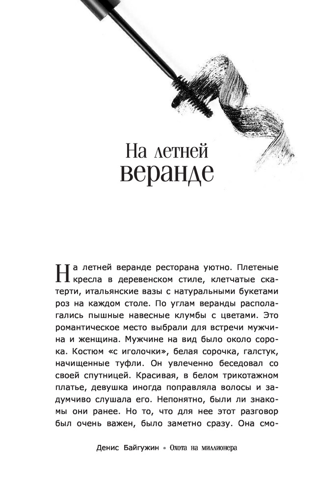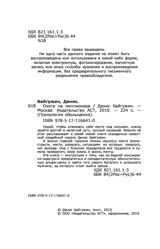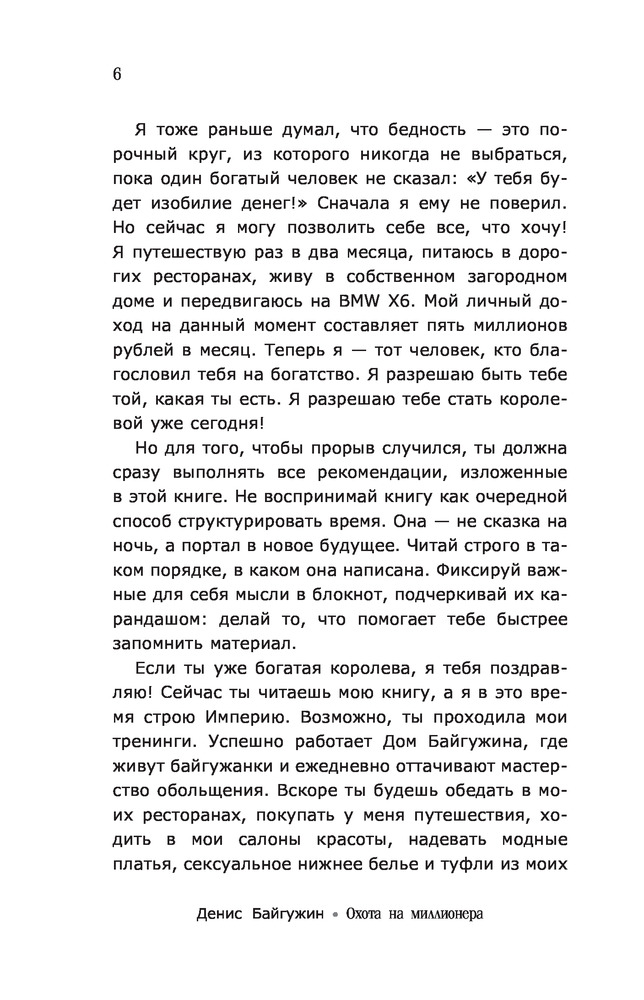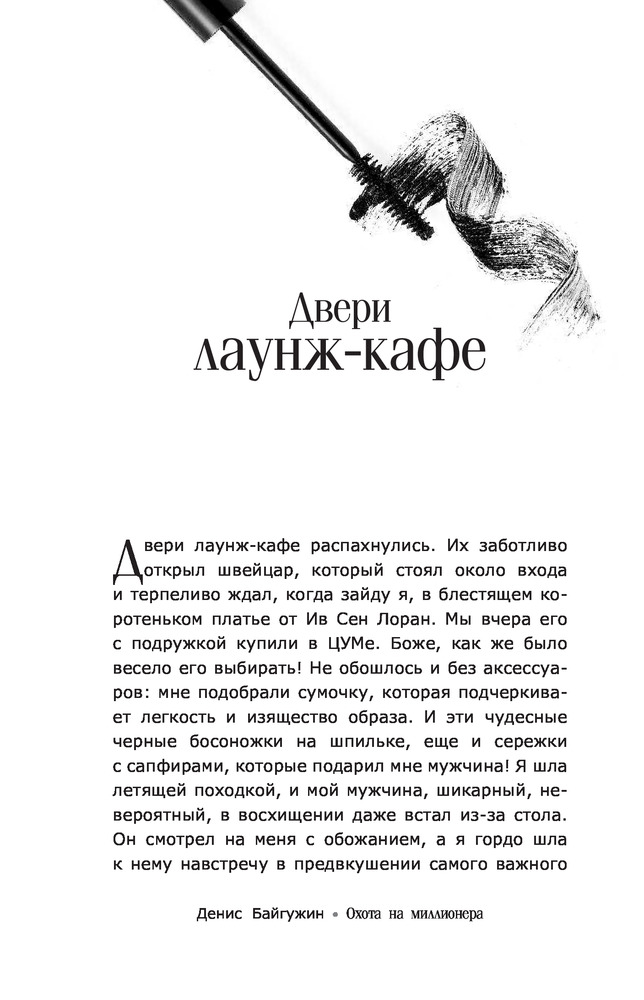 Охота на миллионерамотивационная легко читается реалистичный сюжет тема проституции В данный момент этот товар отсутствует в продаже. Возможно, у нас найдется аналогичный или похожий товар здесь. Серия: Психология обольщения Порой, чтобы отвоевать себе место под солнцем, нужно пройти долгий и нелегкий путь, полный лишений. Именно об этом рассказывает в своей новой книге скандально известный свадебный король Денис Байгужин. В жизни главной героини Алины нашлось место всему: страсти, мести, разврату, ситуациям, из которых, казалось, нет выхода. Она с блеском преодолела все трудности и сумела превратить свою жизнь в жизнь мечты. Эта книга — инструкция к тому, как из бедной консьержки-недотроги превратиться в самодостаточную обольстительную альфа-самку и найти того самого богатого и успешного мужчину, за которого стоит выйти замуж. |