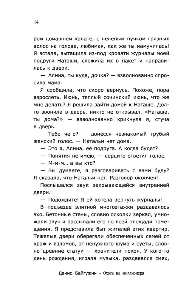 Хочу выразить огромную благодарность Денису за книгу «Охота на Миллионера» ... Сюжет лёгкий и в то же время захватывающий своей реальностью , той самой реальностью , с которой сталкивается абсолютно каждая женщина на пути к своей мудрости : иллюзии относительно мужчин , бесцельная и слепая погоня за баблом, унижение , остервенение , потеря себя ...потеря достойных мужчин .. Рекомендую всем женщинам !