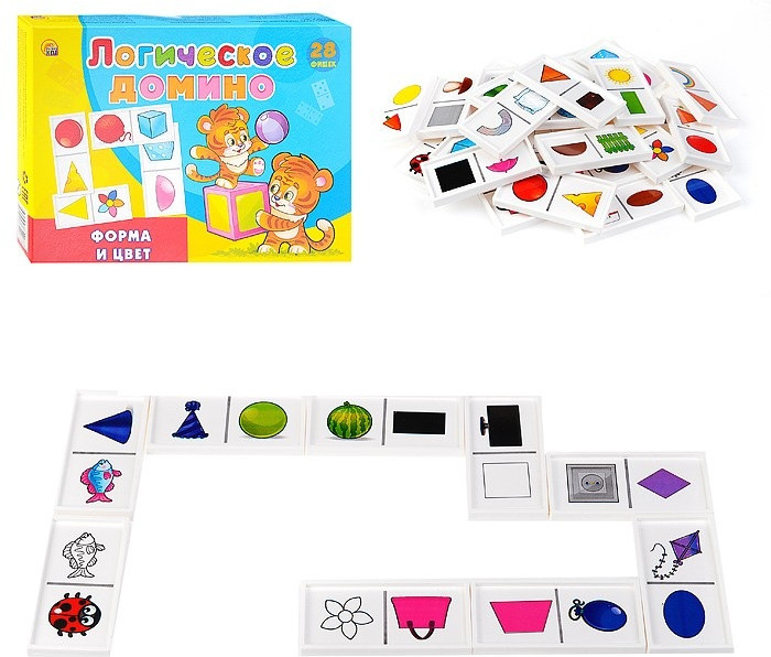 Классное домино, детям 4-9 лет очень нравится играть, развивает внимательность, обучают цветам и фигурам. Рисунки с одной стороны фишек, со второй белый фон. 28 фишек в наборе.