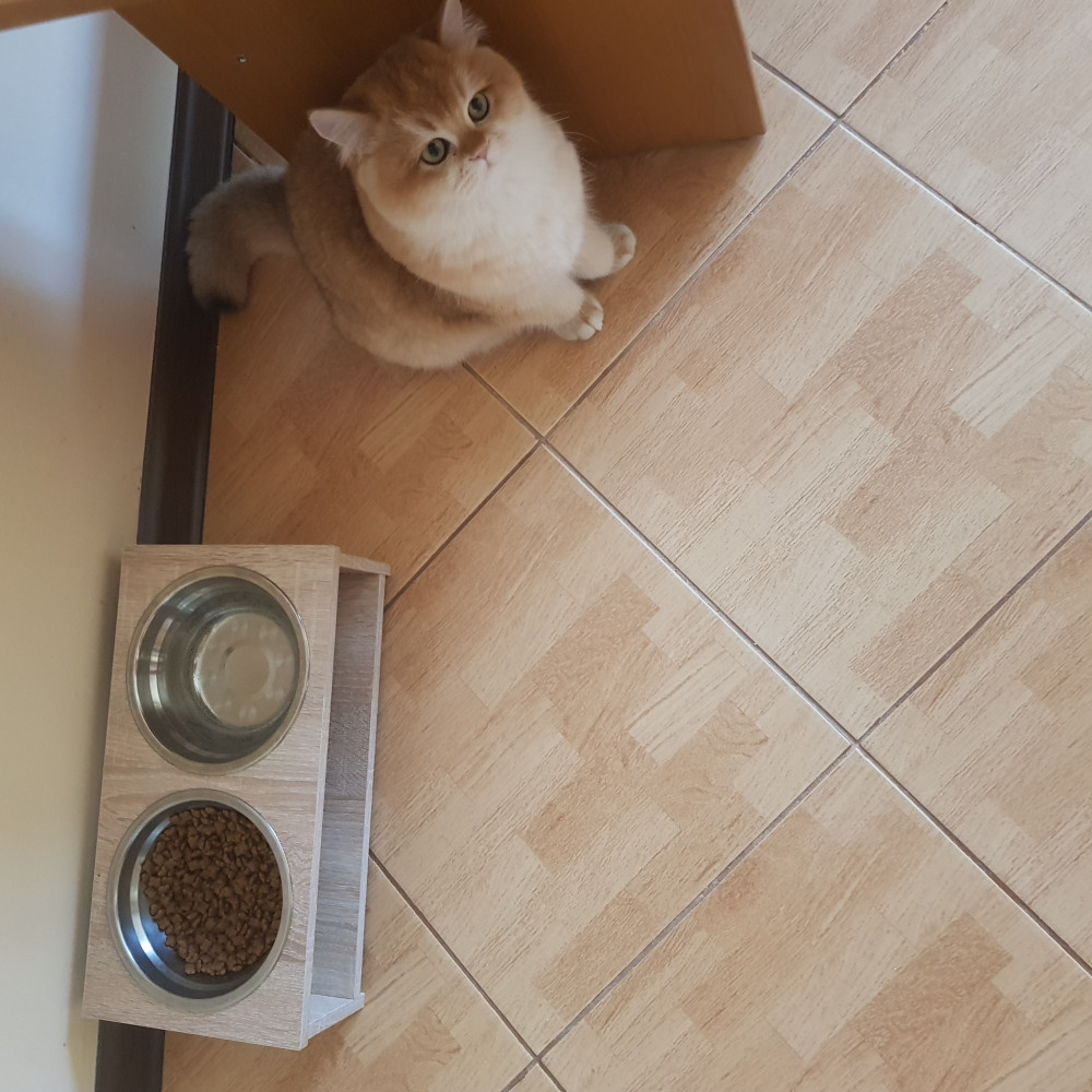 Миска немаленькая. Чашечки большого диаметра и объема. Но у меня британцы а они как известно крупненькие. Один нюанс- ставить у стены иначе двигают легко несмотря на полные чашки.