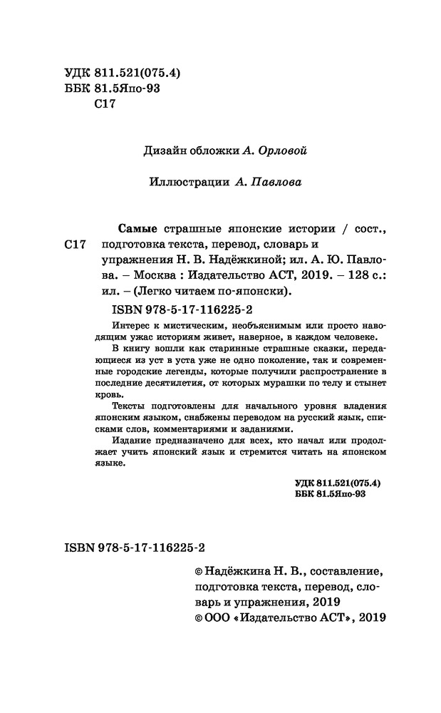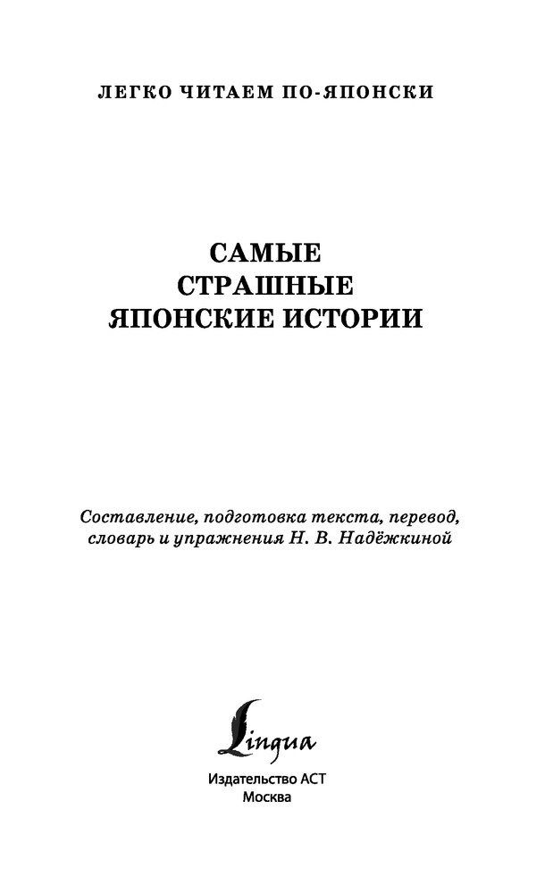 Самые страшные японские историиНадежда Владимировна Надежкина В данный момент этот товар отсутствует в продаже. Возможно, у нас найдется аналогичный или похожий товар здесь. Серия: Легко читаем по-японски Интерес к мистическим, необъяснимым или просто наводящим ужас историям живет, наверное, в каждом человеке. В книгу вошли как старинные страшные сказки, передающиеся из уст в уста уже не одно поколение, так и современные городские легенды, которые получили распространение в последние десятилетия, от которых мурашки по телу и стынет кровь. Тексты подготовлены для начального уровня владения японским языком, снабжены переводом на русский язык, списками слов, комментариями и заданиями. Издание предназначено для всех, кто начал или продолжает учить японский язык и стремится читать на японском языке. |