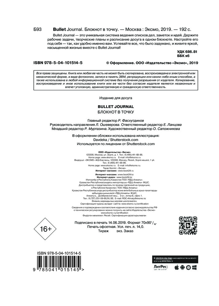 Блокнот «Bullet Journal»В данный момент этот товар отсутствует в продаже. Возможно, у нас найдется аналогичный или похожий товар здесь. Серия: Блокноты в точку. Bullet Journal Bullet Journal — это уникальная система ведения списков дел, заметок и идей. Держите рабочие задачи, творческие планы и расписание досуга в одном блокноте. Настройте его под себя — так, как удобно именно вам. Успевайте все, что было задумано, и живите яркой, насыщенной жизнью вместе с Bullet Journal! |