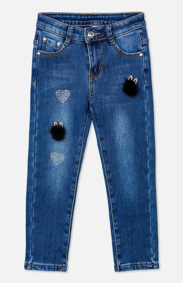 Джинсы для девочки — основа повседневного гардероба. Внутри мягкая текстура — начес. Модель прилегающего силуэта с высокой посадкой. Застежка: молния и пуговица. По ширине пояс регулируется за счет внутренней резинки на пуговицах, что так важно для идеальной посадки в зависимости от комплекции ребенка.Пояс со шлевками, при необходимости можно использовать ремень. Модель декорирована стразами, потертостями и меховыми помпонами.