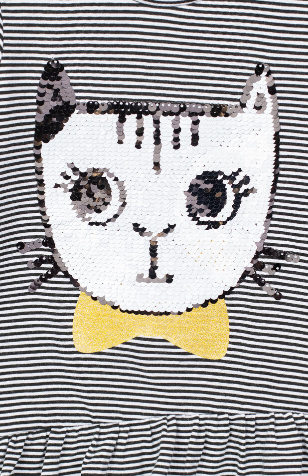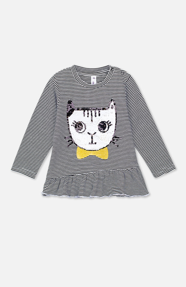 Очень понравился лонгслив. Качество play Today как всегда, на высоте. Мордочка кошечки из пайеток, которые меняют цвет с белого на черный. На 1,3 мес взяла 86р. Есть небольшой запас.