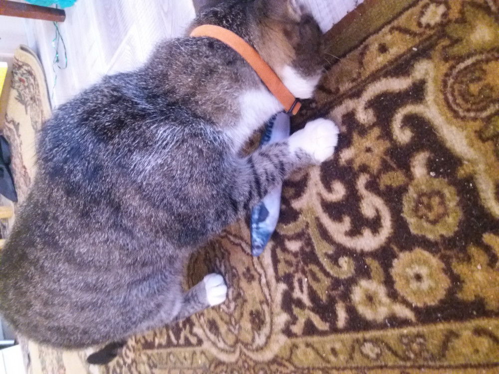 Кот сошел с ума, облизывал, ласкался, не отдавал никак, вцепился и лежал с ней. Придется прятать. Чтоб интерес не потерял.
