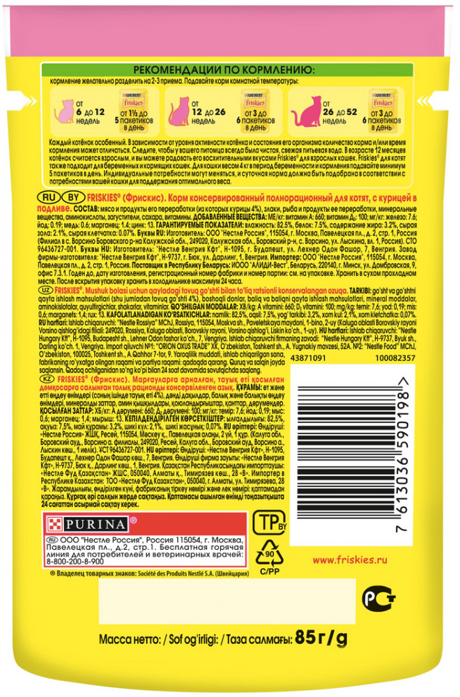 Friskies Корм влажный для котят с курицейВ данный момент этот товар отсутствует в продаже. Возможно, у нас найдется аналогичный или похожий товар здесь. Условия хранения товара: температурный режим от -10 до +25°С. |