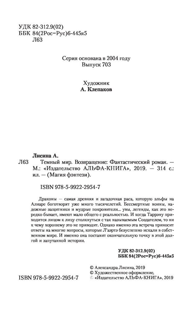 Темный мир. ВозвращениеВ данный момент этот товар отсутствует в продаже. Возможно, у нас найдется аналогичный или похожий товар здесь. Серия: Магия фэнтези Драконы — самая древняя и загадочная раса, которую эльфы на Алиаре боготворят уже много тысячелетий. Бессмертные воины, надежные защитники и мудрые покровители... увы, легенды, как это нередко бывает, имеют мало общего с реальностью. И когда Таррэну приходится лицом к лицу столкнуться с так называемым Создателем, то ни к чему хорошему это не приводит. Однако именно эта встреча приносит ответы на многие вопросы, которые Л’аэртэ безуспешно искали в собственном мире. И именно она поставит окончательную точку в этой долгой и запутанной истории. |