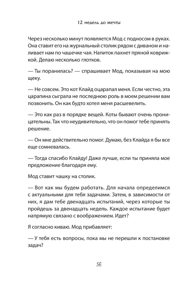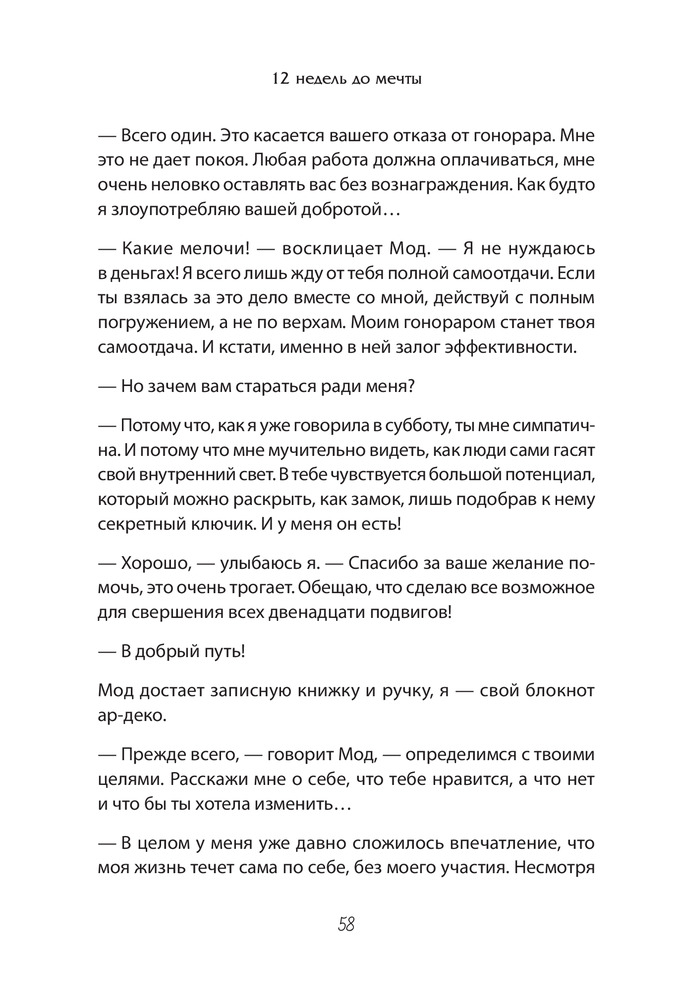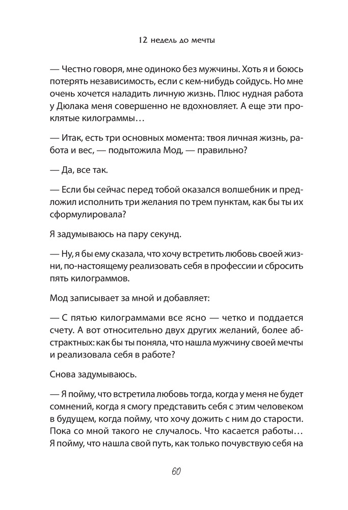 12 недель до мечты. Роман-челленджВ данный момент этот товар отсутствует в продаже. Возможно, у нас найдется аналогичный или похожий товар здесь. Серия: Сам себе психолог Перед вами книга необычного жанра — роман-челлендж. Представьте, что Элизабет из «Ешь, молись, люби» готова взять вас в свое удивительное путешествие, Керри Брэдшоу — отыскать для вас Мужчину мечты, а Бриджет Джонс — сделать первые записи в вашем дневнике о жизни с чистого листа. Героиня романа Кароль-Анн Ашкенази приготовила для вас персональный челлендж —12 простых и необычных заданий по саморазвитию за 12 недель. Они помогут унять внутреннего критика и полюбить себя, встретить вторую половину и найти занятие, приносящее радость каждый день. |