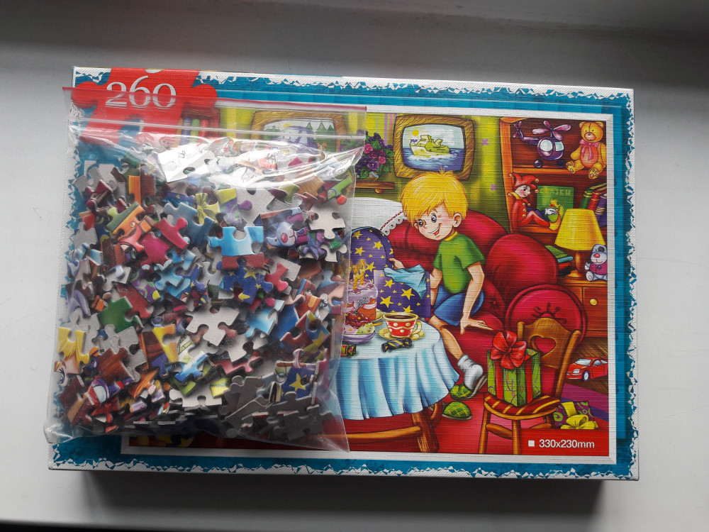 Пазл хороший, не разваливается, когда соберёшь, и что самое главное - все детали на месте. Если придираться, то коробку можно было сделать немного меньше, т.к. занимает много места. А также в пакетике с кусочками пазла имееются его вырезанные опилки.