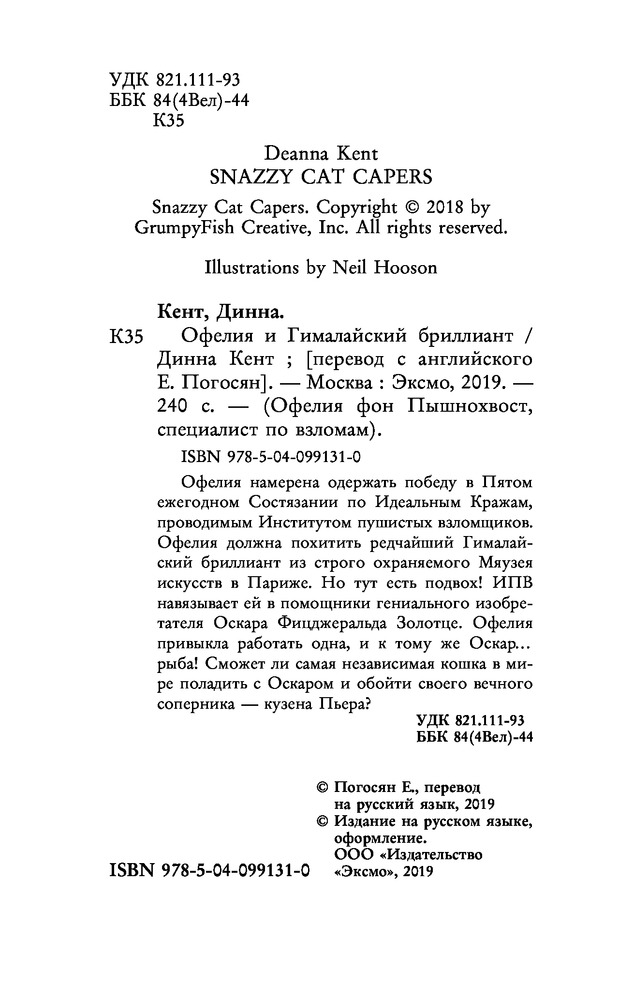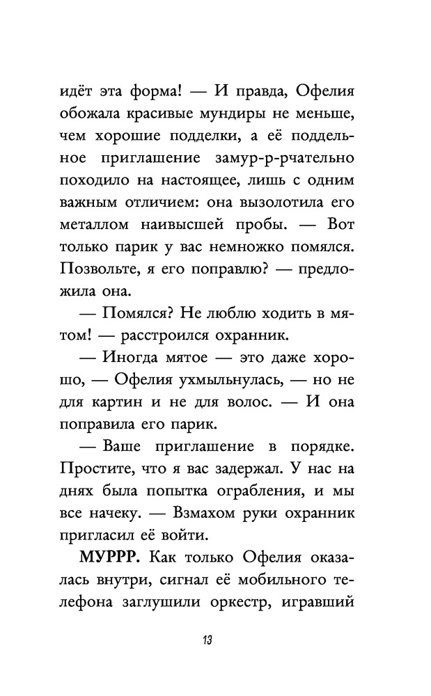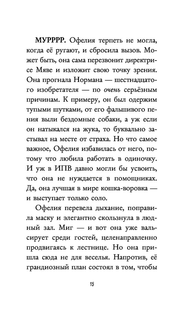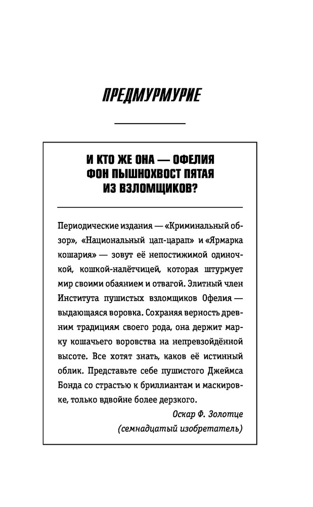Офелия и Гималайский бриллиант (выпуск 1)В данный момент этот товар отсутствует в продаже. Возможно, у нас найдется аналогичный или похожий товар здесь. Серия: Детская. Офелия фон Пышнохвост, специалист по взломам Офелия намерена одержать победу в Пятом ежегодном Состязании по Идеальным Кражам, проводимым Институтом пушистых взломщиков. Офелия должна похитить редчайший Гималайский бриллиант из строго охраняемого Мяузея искусств в Париже. Но тут есть подвох! ИПВ навязывает ей в помощники гениального изобретателя Оскара Фицджеральда Золотце. Офелия привыкла работать одна, и к тому же Оскар... рыба! Сможет ли самая независимая кошка в мире поладить с Оскаром и обойти своего вечного соперника — кузена Пьера? |