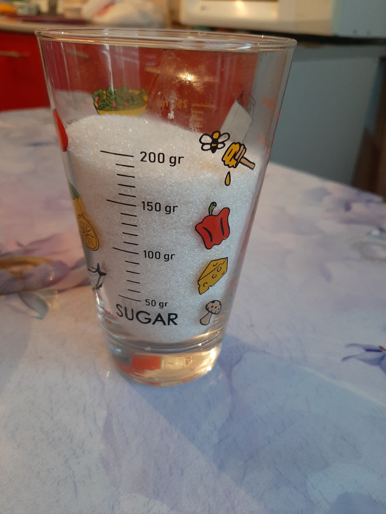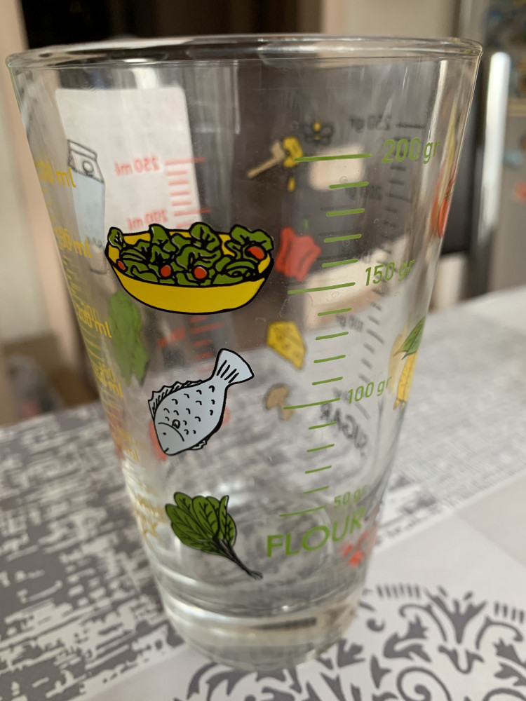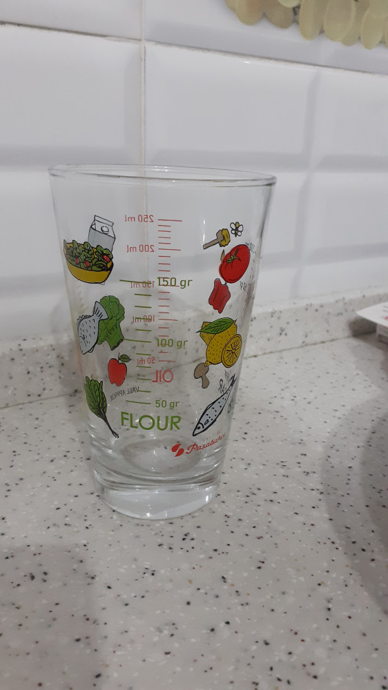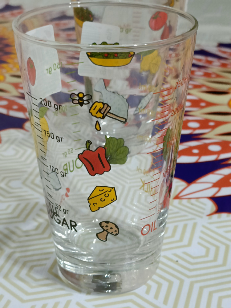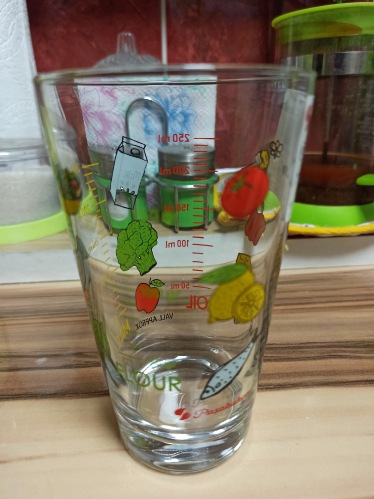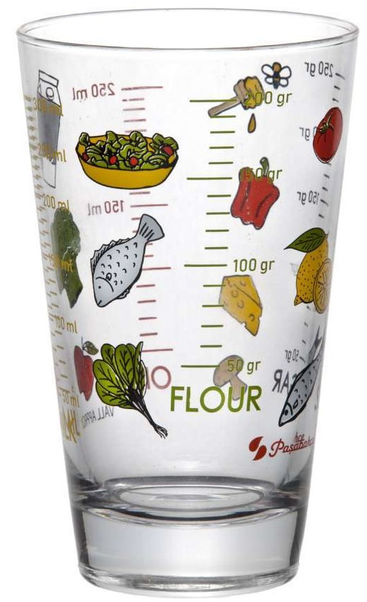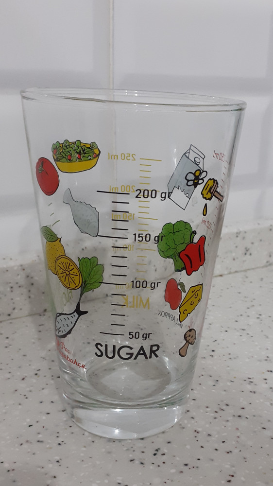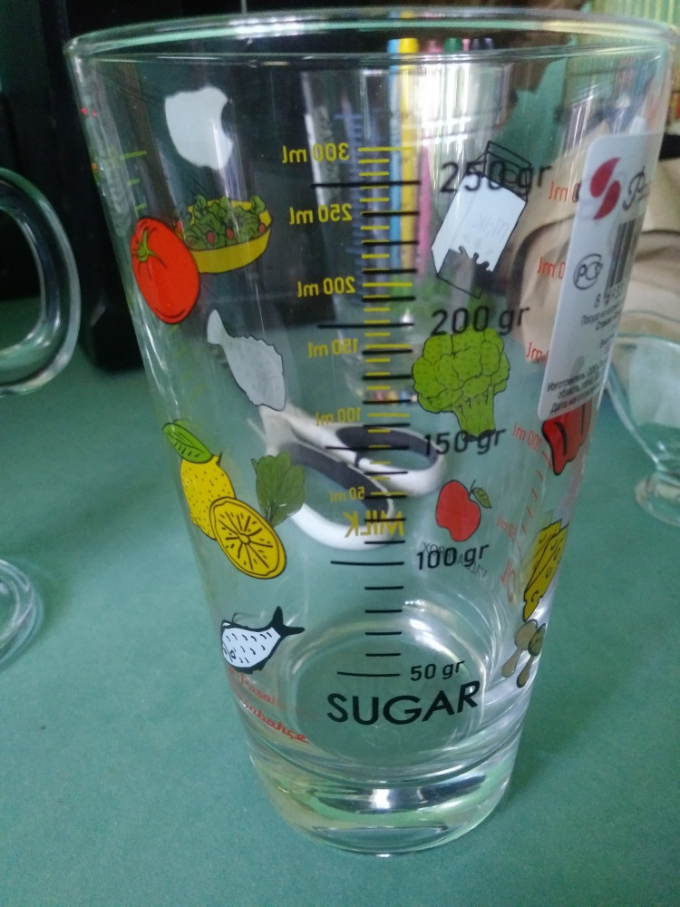 Красивый стакан с картинками и с мерной шкалой для муки, масла и сахара. Незаменимый помощник в приготовлении десертов.