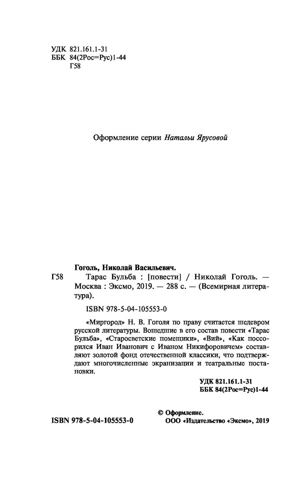 Тарас БульбаВ данный момент этот товар отсутствует в продаже. Возможно, у нас найдется аналогичный или похожий товар здесь. Серия: Всемирная литература «Миргород» Н. В. Гоголя по праву считается шедевром русской литературы. Вошедшие в его состав повести «Тарас Бульба», «Старосветские помещики». «Вий», «Как поссорился Иван Иванович с Иваном Никифоровичем» составляют золотой фонд отечественной классики, что подтверждают многочисленные экранизации и театральные постановки. |