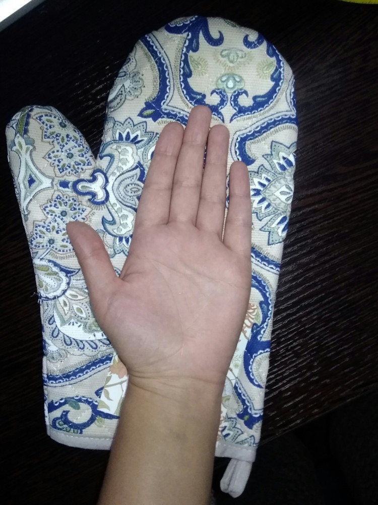 Огромный размер, при том, что рука немаленькая (резиновые перчатки покупаю М, пальцы длинные). Но при этом размере, большой палец прихватки коротковат. Противень из духовки достаю нормально, не печет, наполнитель какой-то есть, но тонкий. Предыдущие прихватки меня устраивали больше, покупку не повторю