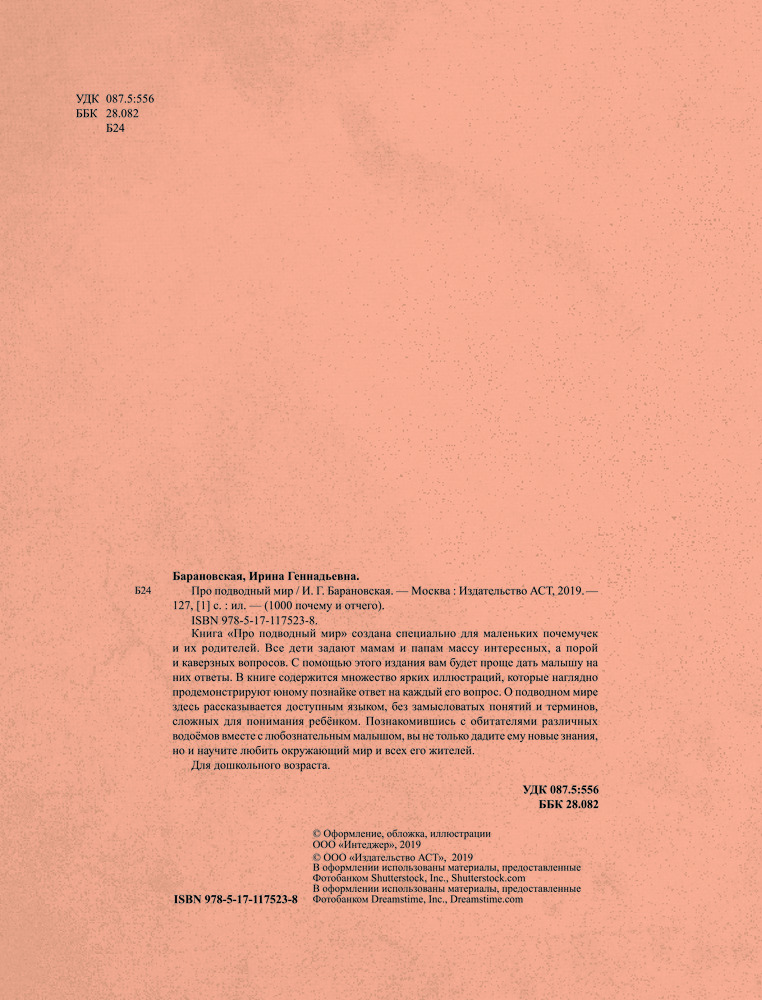 1000 почему и отчего. Про подводный мирВ данный момент этот товар отсутствует в продаже. Возможно, у нас найдется аналогичный или похожий товар здесь. Серия: 1000 почему и отчего Книга «Про подводный мир» создана специально для маленьких почемучек и их родителей. Все дети задают мамам и папам массу интересных, а порой и каверзных вопросов. С помощью этого издания вам будет проще дать малышу на них ответы. В книге содержится множество ярких иллюстраций, которые наглядно продемонстрируют юному познайке ответ на каждый его вопрос. О подводном мире здесь рассказывается доступным языком, без замысловатых понятий и терминов, сложных для понимания ребёнком. Познакомившись с обитателями различных водоёмов вместе с любознательным малышом, вы не только дадите ему новые знания, но и научите его любить окружающий мир и всех его жителей. Для дошкольного возраста. |