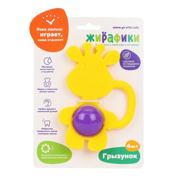 Жирафики Силиконовый грызунок с погремушкой «Жирафик»В данный момент этот товар отсутствует в продаже. Возможно, у нас найдется аналогичный или похожий товар здесь. Грызунок «Жирафик» сделан из безопасного пищевого силикона и выполняет роль прорезывателя для зубов. Грызунок мягкий, лёгкий и очень приятный на ощупь, поэтому малыш с удовольствием будет брать его в руки. Маленькая ручка сделана с учётом размера ладошки крохи, а фактурная, ребристая поверхность предназначена для мягкого массажа дёсен во время роста первых зубов. |