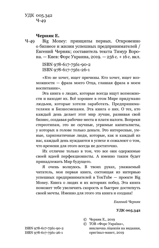 Наконец-то вышла в продажу книга Е. Черняка "Принципы первых". Для тех кто не знаком с автором советую посмотреть пару видео с его YouTube канала Big Money. О книге: содержание пусть оценит каждый сам. Для меня лично это очень мотивирующая и вдохновляющая книга. Качество бумаги высокое, шрифт приятный и как вишенка на торте собственная закладка. Советую её тем кто ищет мотивирующие и вдохновляющие книги. Тем кто ищет истории об интересных личностях и тем кто ценит умные и глубокие мысли.