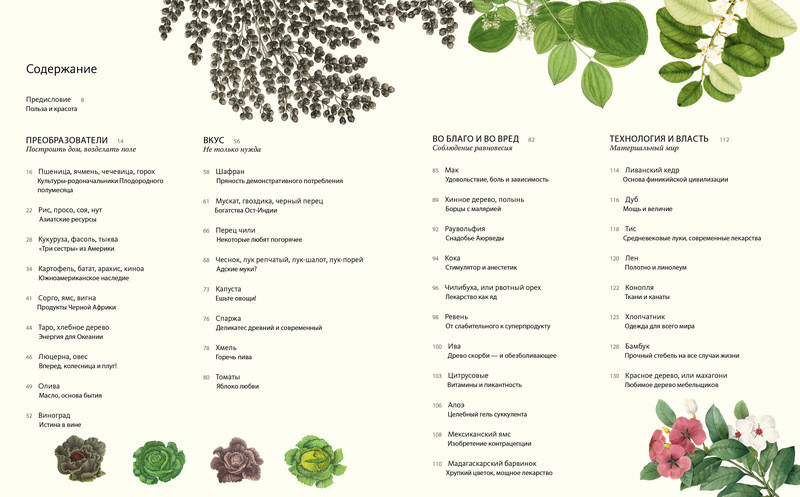 Они начинают с первых окультуренных злаков, заложивших основы развития цивилизаций (пшеница, рис, кукуруза), посвящают следующий раздел растениям, из которых создавался наш материальный мир — корабли, жилища, одежда, мебель (дуб, лен, хлопок), затем переходят к товарным культурам, радикально повлиявшим на мировую экономику, колониализм и постколониализм, равно как и на привычные нам модели потребления (чай, кофе, сахарный тростник).
