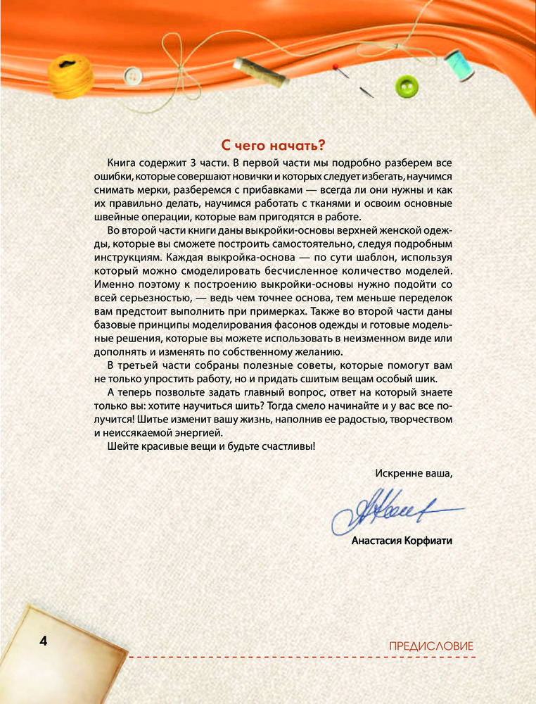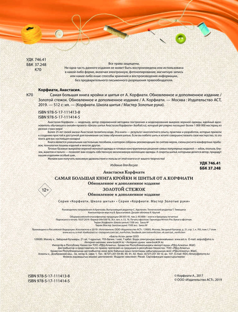 Самая большая книга кройки и шитья от А. Корфиати. Обновленное и дополненное изданиеВ данный момент этот товар отсутствует в продаже. Возможно, у нас найдется аналогичный или похожий товар здесь. Серия: Корфиати. Школа шитья Анастасия Корфиати — модельер, автор современной методики построения и моделирования выкроек верхней одежды, идейный вдохновитель обучающего онлайн-проекта «Школа шитья Анастасии Корфиати», который регулярно посещают более 1 000 000 мастериц из разных стран мира! Более 25 лет своей жизни Анастасия посвятила моде. Эта книга — результат многолетнего опыта, практики и разработок, которые привели к созданию простой и доступной для понимания системы обучения шитью. Если вы любите шить и хотите совершенствовать свое мастерство, то эта книга для вас настоящая находка! Книга является уникальным настольным пособием, в котором собраны рекомендации по снятию мерок, схемы расчета комфортных прибавок, технологии пошива изделий и многое другое. Точные базовые выкройки верхней женской одежды и готовые конструктивные решения самых популярных моделей — юбок, платьев, блузок, жакетов и пальто — позволят вам создать собственную эксклюзивную коллекцию одежды. А секреты шитья, которыми делится автор, придадут вашим изделиям особый шик. Желаем вам получить максимум удовольствия и пользы от этой книги и от вашего творчества! |