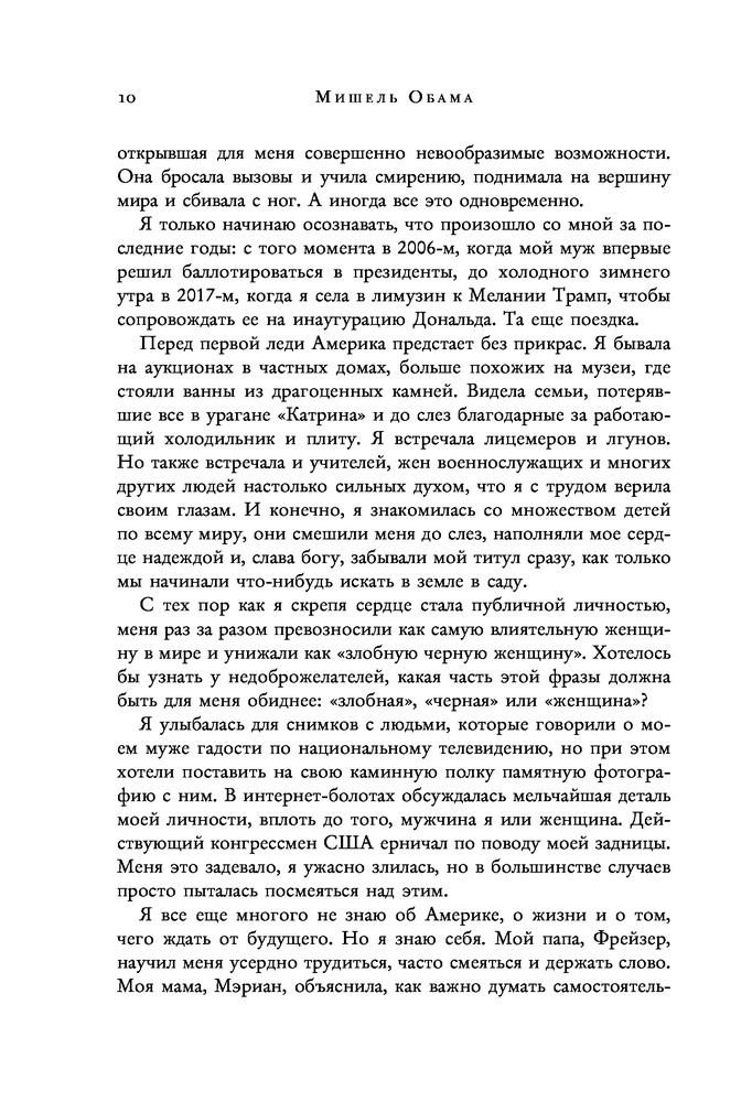 Невероятно шикарная книга. Это мемуары. В половине книги, это около 150 страниц, в подробностях описывается детство, юношество и молодость Мишель. В книге вы найдёте подробности зарождения романа будущего президента Америки и Мишель. Они познакомились тогда, когда Барак думать и не думал о политической карьере, за плечами которого не было ничего - ни денег, ни власти, ни нужных связей. В этом вся и прелесть этой книги - читатель узнаёт настоящую президентскую чету, их устои и взгляды на жизнь, взлеты и падения, как оно есть. Во второй половине книги автор очень интересно излагает мысли о плюсах и минусах жизни первой леди, о ее жизни в Белом доме, его устоях, прислугах, политическом этикете… переживаниях во время выборов на второй президентский срок. Мишель в книге говорит и ее дружбе с четой Байденов, войне с Хилари Клинтон и ненависти к Трампу… Книга невероятно шикарная, даже если вы не интересуетесь политикой, берите ее вы не пожалеете,